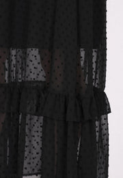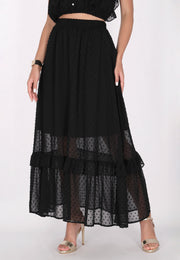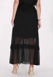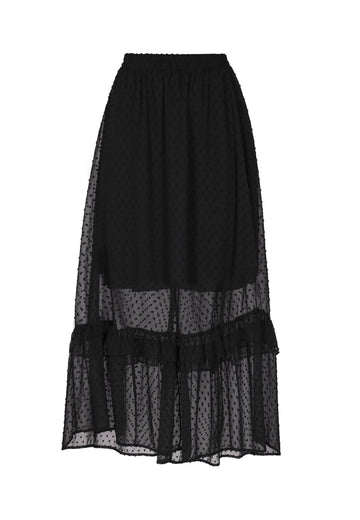 Gönnen Sie sich den Charme dieses romantischen Dobby-Maxirocks, einer Vision von Eleganz und Charme. Mit seiner hohen Taille und der mit zarten Rüschen verzierten Stufenstruktur strahlt dieser lange Rock eine feminine Anmut aus, die sowohl bezaubernd als auch vielseitig ist. Der elastische Bund sorgt für eine bequeme Passform, während der halbtransparente Stoff mit Punktmuster Ihrem Ensemble Struktur und Tiefe verleiht. Genießen Sie die fließende Silhouette dieses bezaubernden Stücks, das Ihrer Garderobe einen Hauch von Romantik und Raffinesse verleiht. Dieses Produkt ist Teil der Romantic Collection