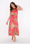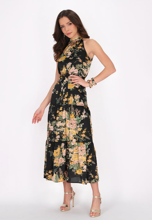 Wir präsentieren ein Kleid aus unserer Fashion Look Kollektion. Es verfügt über einen Neckholder-Ausschnitt mit einem taillierten Oberteil und einem fließenden Saum für eine stilvolle Silhouette. Die geraffte Taille und der ausgestellte Saum sorgen für eine bequeme Passform. Dieses Maxikleid mit Blumenmuster ist perfekt für legere oder halbformelle Anlässe und verleiht Ihrer Alltagsmode Eleganz.