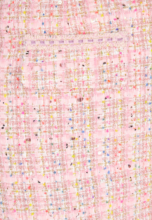 Treten Sie ein in Eleganz mit diesem Minirock aus der Fashion Look Kollektion. Der figurbetonte Schnitt zeigt ein schickes gewebtes Karomuster. Der hoch taillierte Rock, verziert mit Revers und Reißverschlussdetails, strahlt Chic aus. Hergestellt aus Bouclé-Stoff mit metallischem Faden und Pailletten, ist er perfekt für den Abend.
