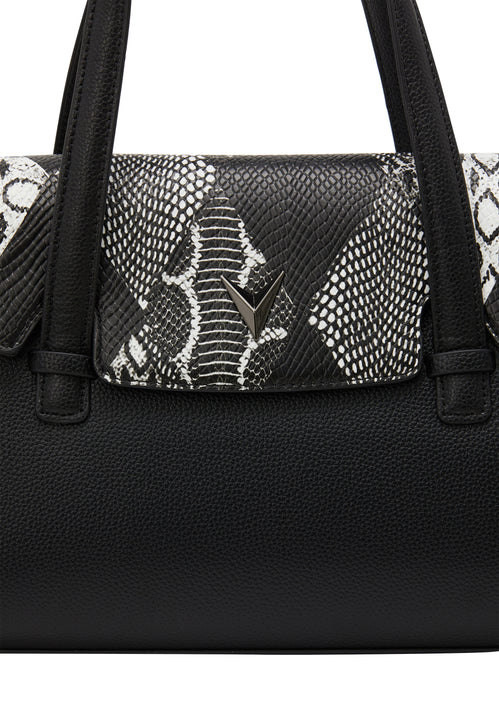 Entdecken Sie eine strukturierte Handtasche, die Stil und Funktion vereint und ein Alligator-Muster auf der vorderen Klappe aufweist. Mit einer genarbten Textur am Körper verfügt sie über einen zusätzlichen Riemen für Vielseitigkeit. Eine außen angebrachte Reißverschlusstasche sorgt für Bequemlichkeit und macht sie ideal für elegante Anlässe, während sie eine schicke Silhouette bewahrt, die perfekt zu jedem Outfit passt.