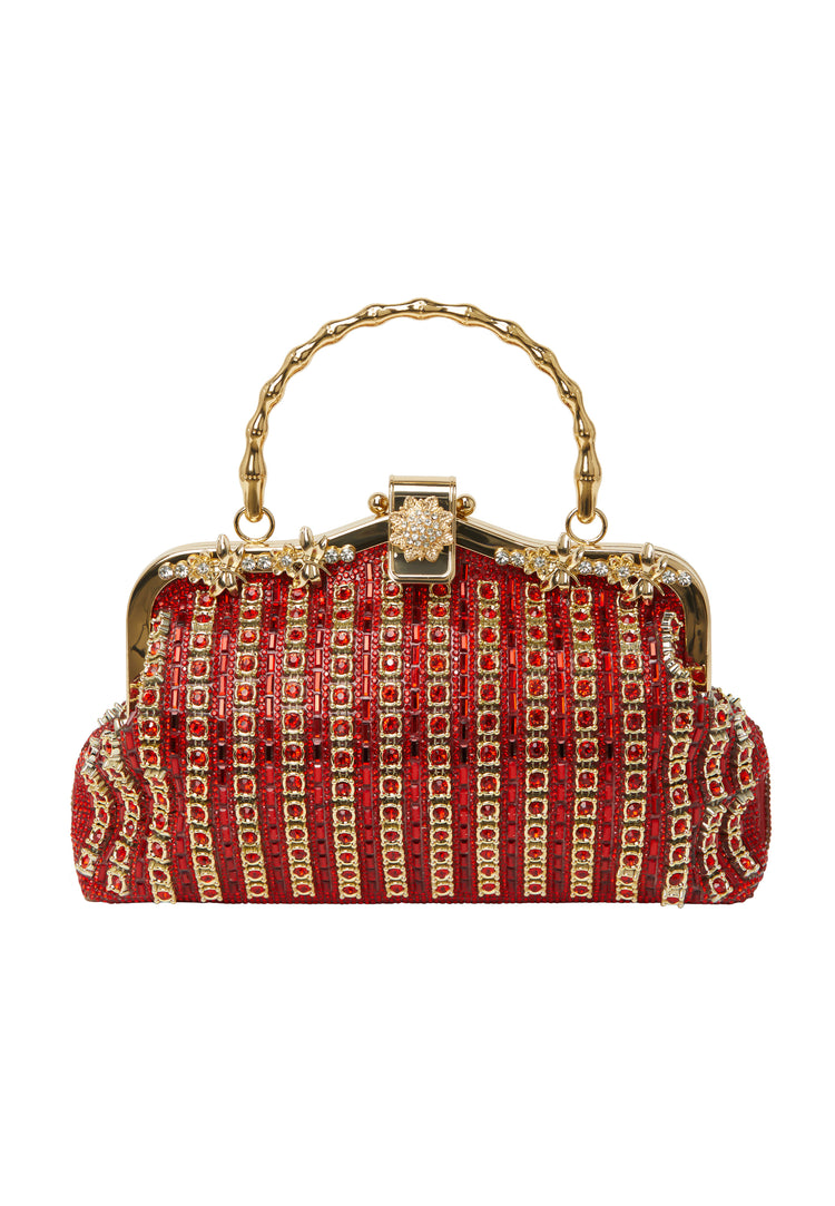 Entworfen für elegante Abende, präsentiert diese Handtasche eine raffinierte Trapezform und einen gedrehten Griff. Mit einem dekorativen Verschluss im Diamantmuster und floralen Akzenten verbindet sie Vintage-Charme mit modernem Stil. Die strukturierte Außenseite schimmert mit luxuriösen Details, während eine Innentasche und eine zusätzliche Kette die Funktionalität für formelle Anlässe erhöhen.