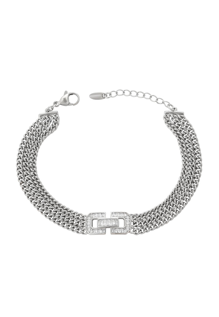 Erweitern Sie Ihre Schmucksammlung mit diesem atemberaubenden Gliederarmband. Sein Multi-Chain-Design und die Kristallakzente strahlen Eleganz und funkelnde Schönheit aus. Ein sicherer Karabinerverschluss sorgt für eine perfekte Passform, während das schlichte Design und die filigrane Webart Flexibilität und ein zeitloses Accessoire bieten, das jedes Outfit wunderschön ergänzt. Dieses Armband ist Teil der Schmuckkollektion.