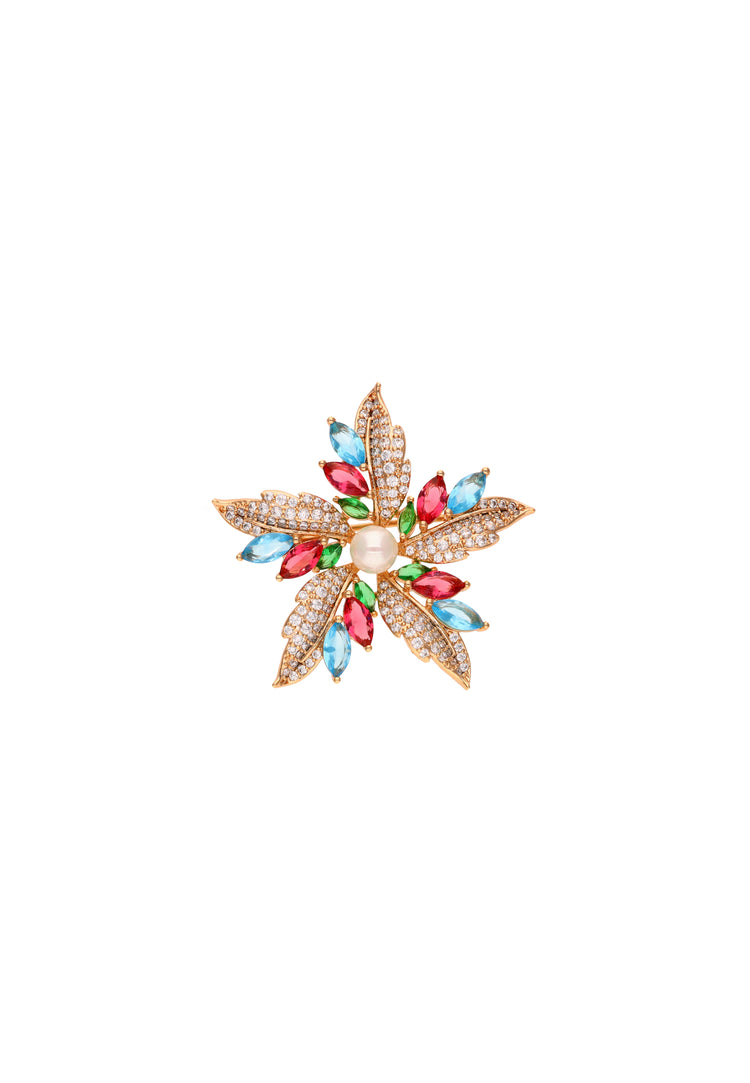 Diese elegante Brosche aus der Schmuckkollektion zeigt ein zartes Blumenmotiv, besetzt mit Kristallen und verziert mit funkelnden Strasssteinen sowie einer glänzenden Perle, gefertigt aus Kupfer mit einem glänzenden, gemusterten Finish für einen luxuriösen, schimmernden Effekt. Entworfen mit einer Nadel auf der Rückseite für sicheren Halt, verbindet sie Raffinesse mit zeitloser Eleganz. Dieses exquisite Stück ist ein vielseitiges Accessoire, um jedes Outfit mühelos stilvoll aufzuwerten.