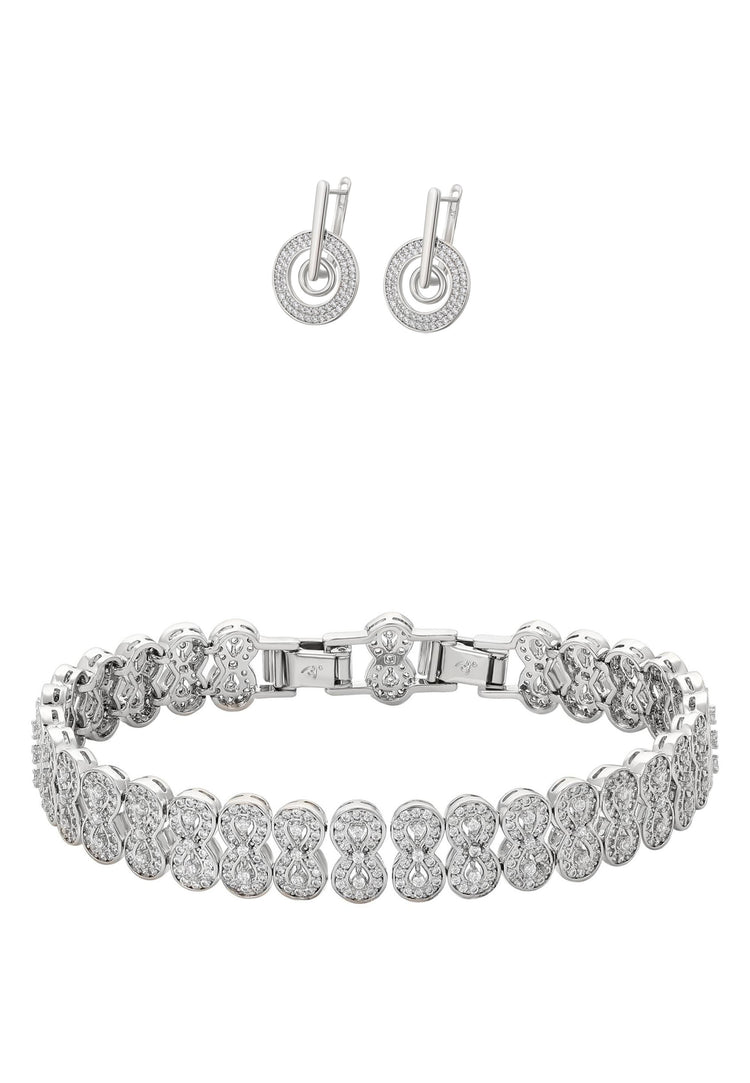 Dieses einzigartige Schmuckset, bestehend aus Ohrringen und einem Armband, verbindet Eleganz, Brillanz und zeitlosen Stil. Hergestellt aus hochwertigem Kupfer, verziert mit funkelnden Zirkoniasteinen und mit einem kunstvollen und schimmernden Muster versehen, verleiht es jedem Outfit einen Hauch von subtiler Luxus. Die Ohrringe verfügen über einen Steckverschluss für Komfort und Sicherheit, während das Armband einen Klappverschluss für einen sicheren Sitz hat. Dieses schimmernde Set ist perfekt für besondere Anlässe und betont den klassischen und anspruchsvollen Charakter jedes Outfits.