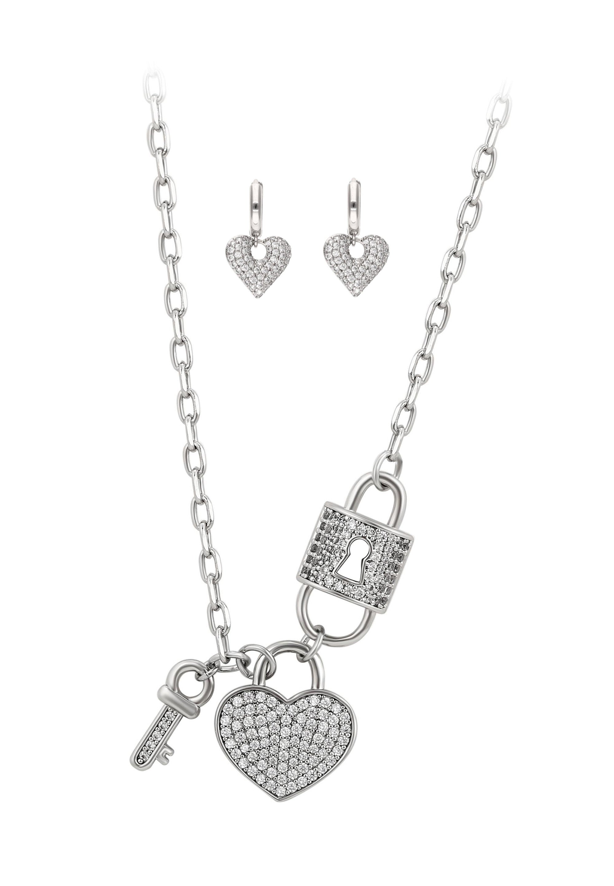 Erhöhen Sie Ihren Stil mit diesem atemberaubenden Kettenhalsketten- und Ohrring-Set aus unserer Schmuckkollektion. Gefertigt aus Kupfer, verfügt das Set über eine raffinierte Kettenhalskette mit einem sicheren Karabinerverschluss und passende Ohrringe mit einem bequemen Klappverschluss. Beide Teile sind wunderschön gestaltet mit einem charmanten Herzmotiv, das mit funkelnden Strasssteinen verziert ist und Ihrem Look einen Hauch von Romantik und Glamour verleiht. Perfekt für den täglichen Gebrauch und besondere Anlässe bringt dieses elegante Set zeitlosen Glanz und Raffinesse in jede Schmuckkollektion.