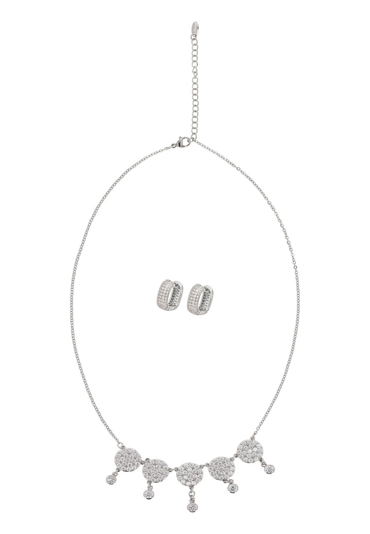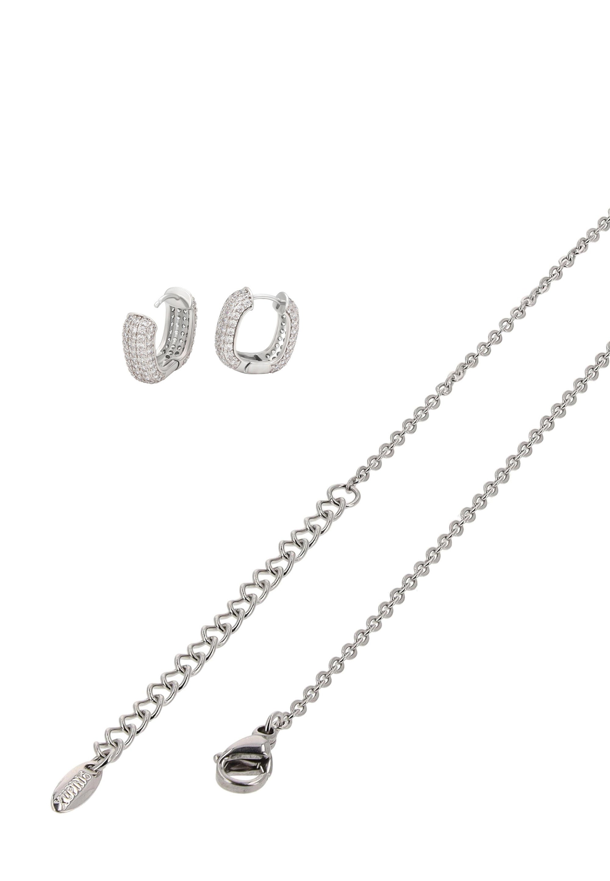 Verleihen Sie Ihrem Stil mit diesem funkelnden Schmuckset aus unserer Schmuckkollektion das gewisse Etwas. Dieses elegante Halsketten- + Ohrring-Set besteht aus einer Kupferkette mit sicherem Karabinerverschluss und passenden Ohrringen mit Klappverschluss, die beide mit schillernden Strasssteinen verziert sind. Mit einem glänzenden Muster gefertigt, verkörpert dieses Set perfekt Eleganz, Vielseitigkeit und zeitlose Anziehungskraft und ist ideal, um Alltagsoutfits aufzuwerten oder besonderen Anlässen Raffinesse zu verleihen. Eine raffinierte und strahlende Wahl, dieses Schmuckset bringt mühelosen Glamour und klassischen Charme in jeden Look.