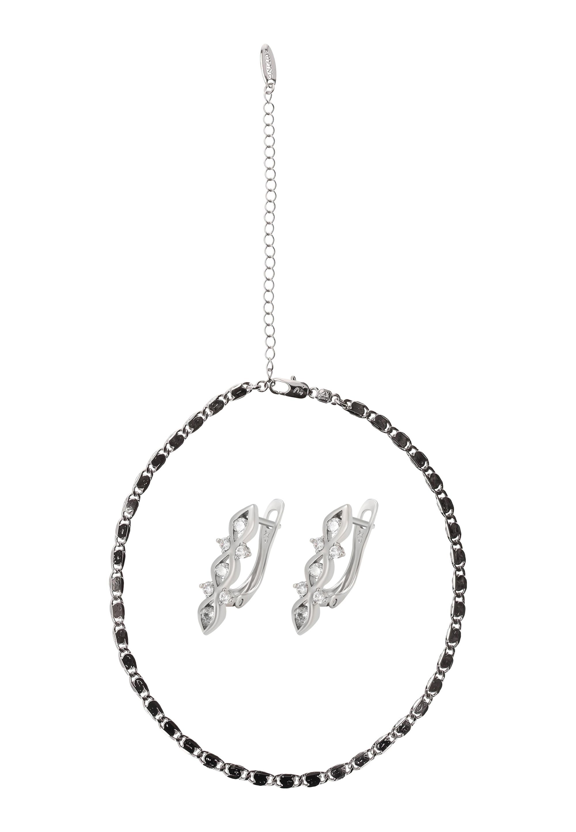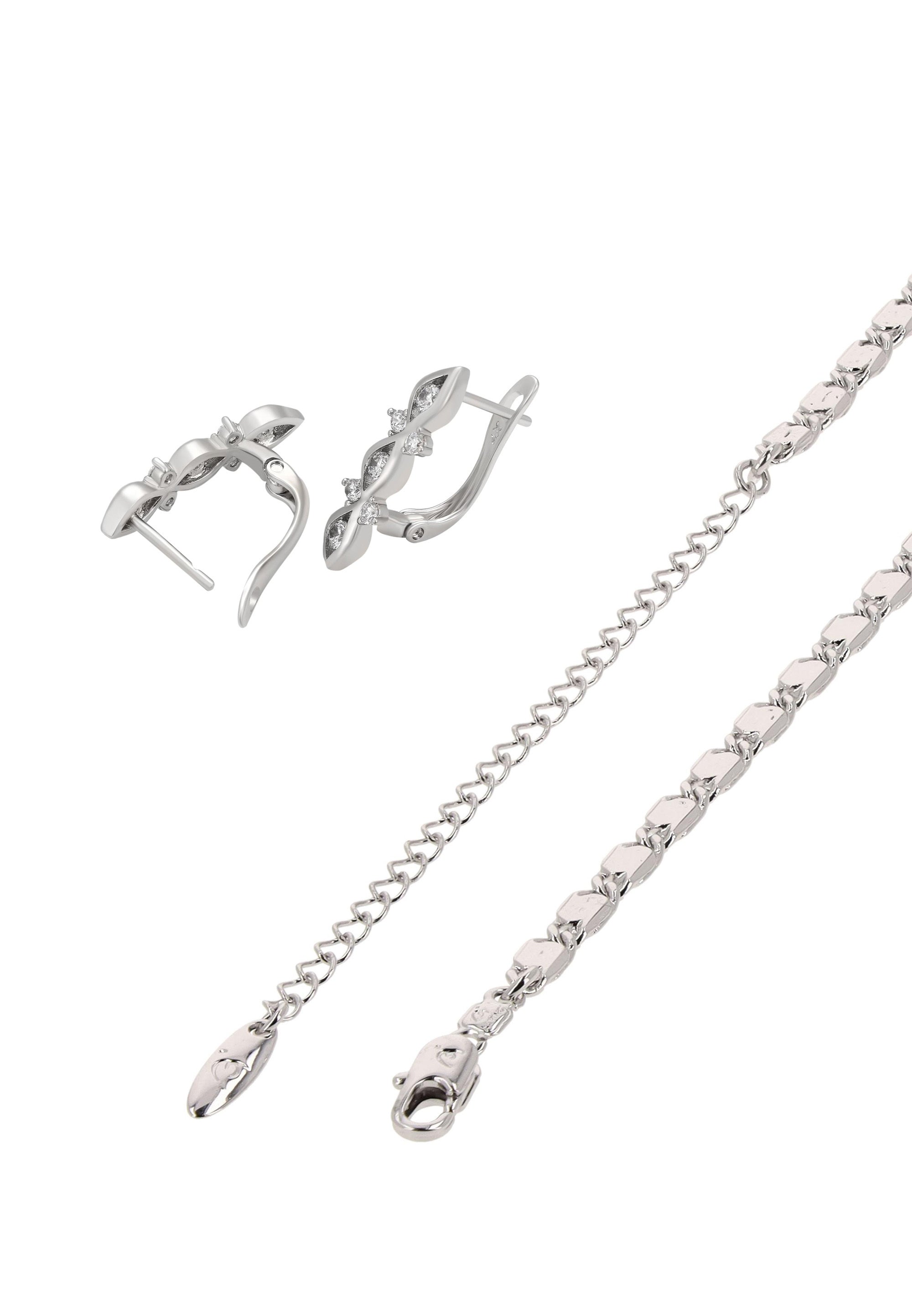Fügen Sie mit diesem Schmuckset aus unserer Schmuckkollektion einen Hauch von raffinierter Eleganz hinzu. Dieses Armband- + Ohrring-Set ist aus Kupfer gefertigt und verfügt über ein schlichtes Muster für einen eleganten, zeitlosen Look. Das Gliederarmband ist mit einem sicheren Karabinerverschluss ausgestattet, während die Ohrringe mit funkelnden Strasssteinen verziert und mit Steckverschluss versehen sind. Elegant, vielseitig und zeitlos ist dieses Set perfekt, um Alltagsoutfits aufzuwerten oder besonderen Anlässen eine besondere Note zu verleihen.