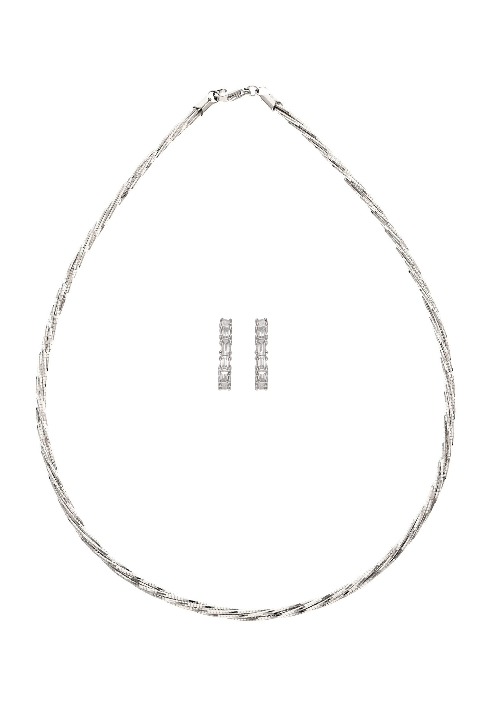 Funkeln Sie mit Raffinesse mit diesem Schmuckset aus unserer Schmuckkollektion. Dieses Halsketten- + Ohrring-Set ist aus Kupfer gefertigt und hat ein schlichtes Muster für einen zeitlosen Look. Die Halskette verfügt über einen sicheren Karabinerverschluss und ein gedrehtes Design, während die mit Kristallen besetzten Creolen mit Schmetterlingsverschlüssen für einen bequemen Sitz versehen sind. Elegant, vielseitig und zeitlos verleiht dieses Set mühelosen Glamour sowohl Alltagsoutfits als auch besonderen Anlässen.