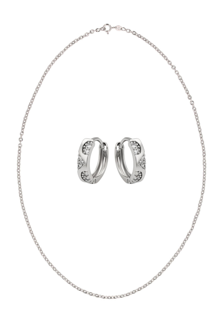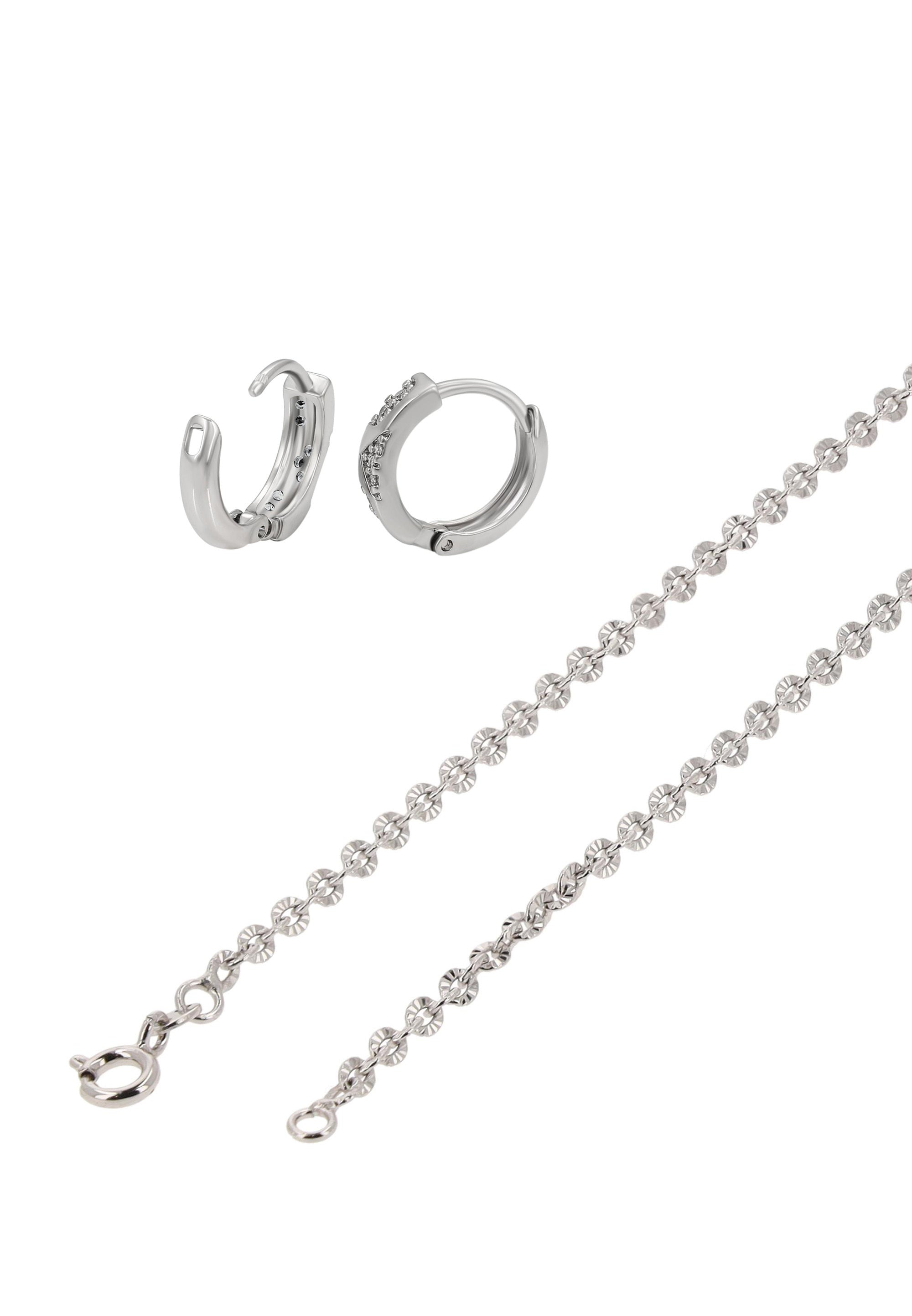 Fügen Sie Ihrem Look mit diesem Schmuckset aus unserer Schmuckkollektion einen dezenten Glanz hinzu. Dieses Halsketten- + Ohrring-Set ist aus Kupfer mit einem schlichten Muster gefertigt und verfügt über eine klassische Kettenhalskette mit einem sicheren Karabinerverschluss. Die passenden Creolen sind zart mit Strasssteinen verziert und mit Scharnierverschlüssen für einen bequemen, zuverlässigen Sitz versehen. Elegant, vielseitig und zeitlos verleiht dieses Set sowohl Alltagsoutfits als auch besonderen Anlässen mühelose Raffinesse.