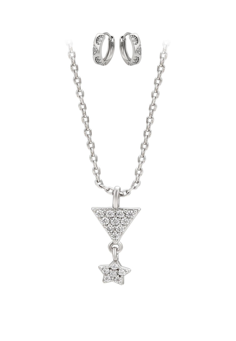 Fügen Sie Ihrem Stil mit diesem Schmuckset aus unserer Schmuckkollektion strahlenden Glanz hinzu. Dieses Halsketten- + Ohrring-Set ist aus Kupfer mit einem schlichten Muster gefertigt und verfügt über eine Kette mit einem sicheren Karabinerverschluss sowie einen Anhänger, der mit Strasssteinen verziert ist. Die passenden Creolen sind zart mit Strasssteinen geschmückt und mit Klappverschlüssen für einen bequemen, zuverlässigen Sitz versehen. Elegant, vielseitig und zeitlos verleiht dieses Set mühelose Raffinesse sowohl Alltagsoutfits als auch besonderen Anlässen.