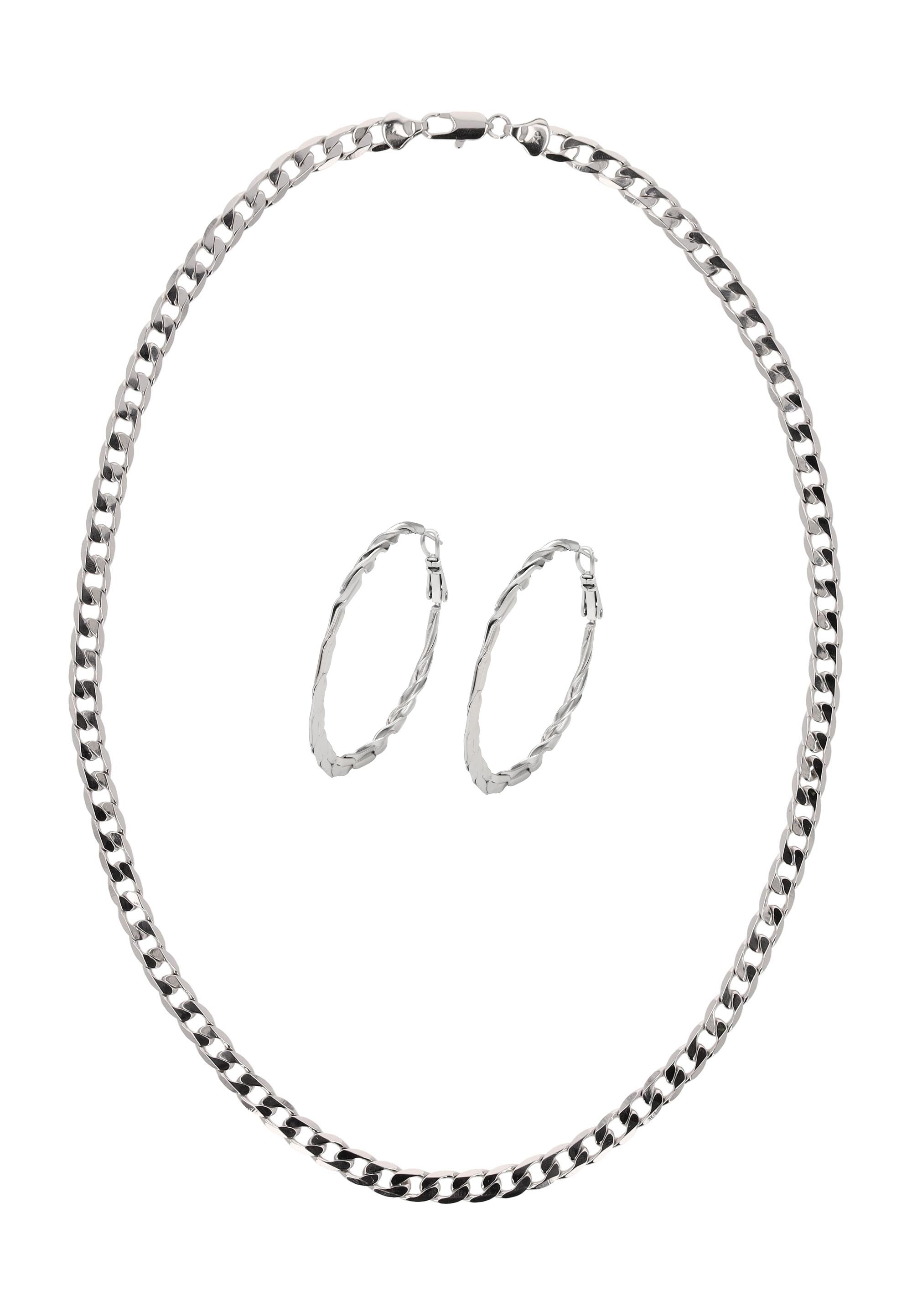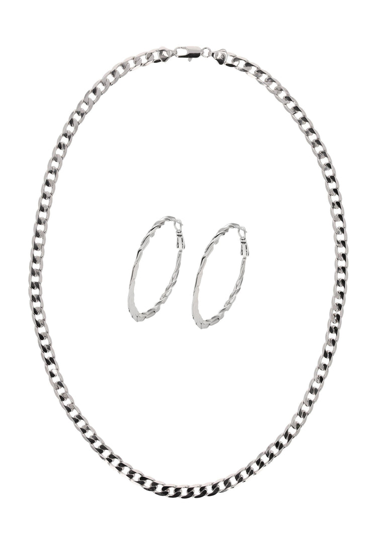 Erhöhen Sie Ihren Stil mit diesem Schmuckset aus unserer Schmuckkollektion. Dieses Halsketten- + Ohrring-Set ist aus Kupfer gefertigt und hat ein schlichtes Muster, mit einer klassischen Panzerkette und einem sicheren Karabinerverschluss. Die passenden Creolen zeigen ein stilvolles gedrehtes Design und sind mit Scharnierverschlüssen für einen bequemen, zuverlässigen Sitz versehen. Elegant, vielseitig und zeitlos verleiht dieses Set mühelose Raffinesse sowohl Alltagsoutfits als auch besonderen Anlässen.