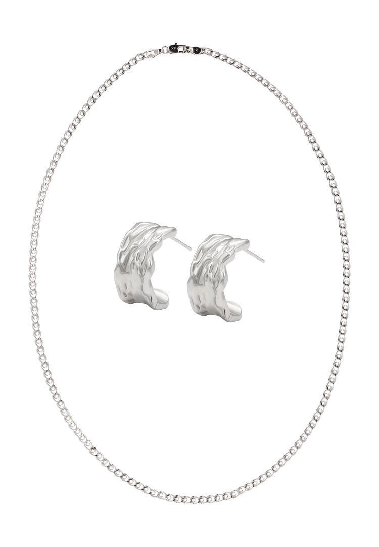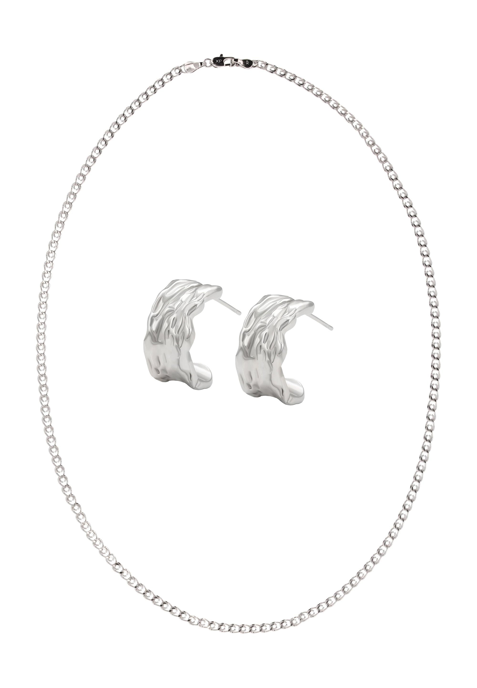 Heben Sie Ihren Stil mit diesem Schmuckset aus unserer Schmuckkollektion hervor. Dieses Halsketten- + Ohrring-Set ist aus Kupfer mit einem schlichten Muster gefertigt und verfügt über eine klassische Kettenhalskette mit einem sicheren Karabinerverschluss. Die passenden organisch geformten Ohrringe sind mit Schmetterlingsverschlüssen für einen bequemen, zuverlässigen Sitz versehen. Elegant, vielseitig und zeitlos verleiht dieses Set mühelose Raffinesse sowohl Alltagsoutfits als auch besonderen Anlässen.