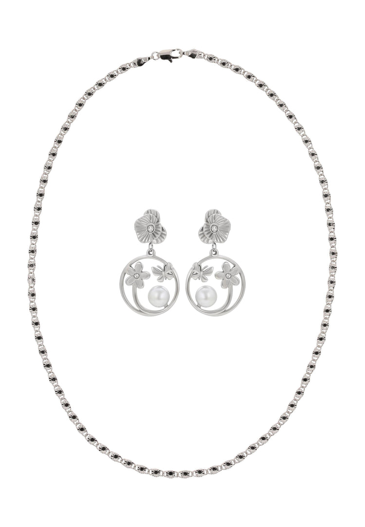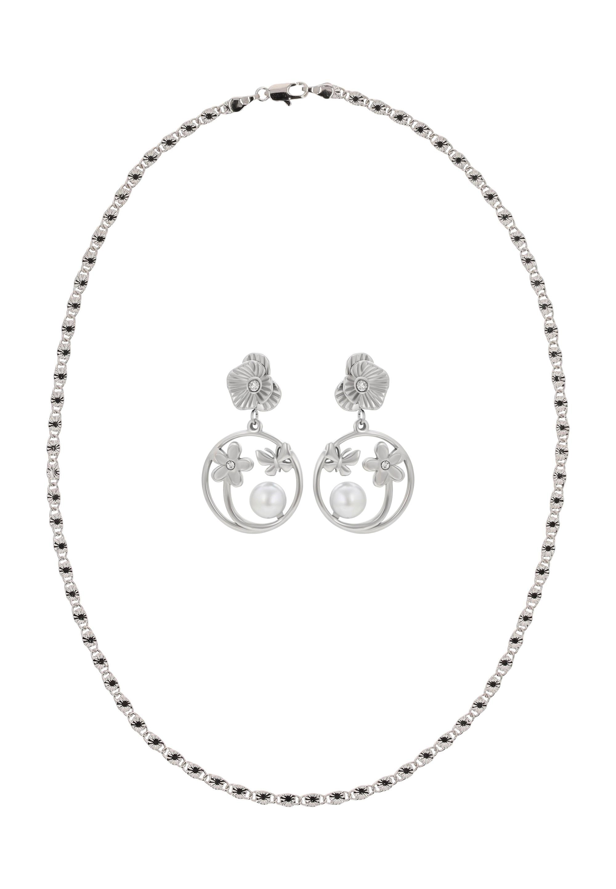 Bringen Sie mit diesem Schmuckset aus unserer Schmuckkollektion einen Hauch floraler Eleganz in Ihren Stil. Dieses Halsketten- + Ohrring-Set ist aus verschiedenen Materialien mit einem schlichten Muster gefertigt und verfügt über eine zarte Boxkette mit einem sicheren Karabinerverschluss. Die passenden Ohrringe mit floralem Motiv sind zart mit Strasssteinen verziert und mit Schmetterlingsverschlüssen für einen bequemen, zuverlässigen Sitz versehen. Elegant, vielseitig und zeitlos verleiht dieses Set sowohl Alltagsoutfits als auch besonderen Anlässen subtile Raffinesse.