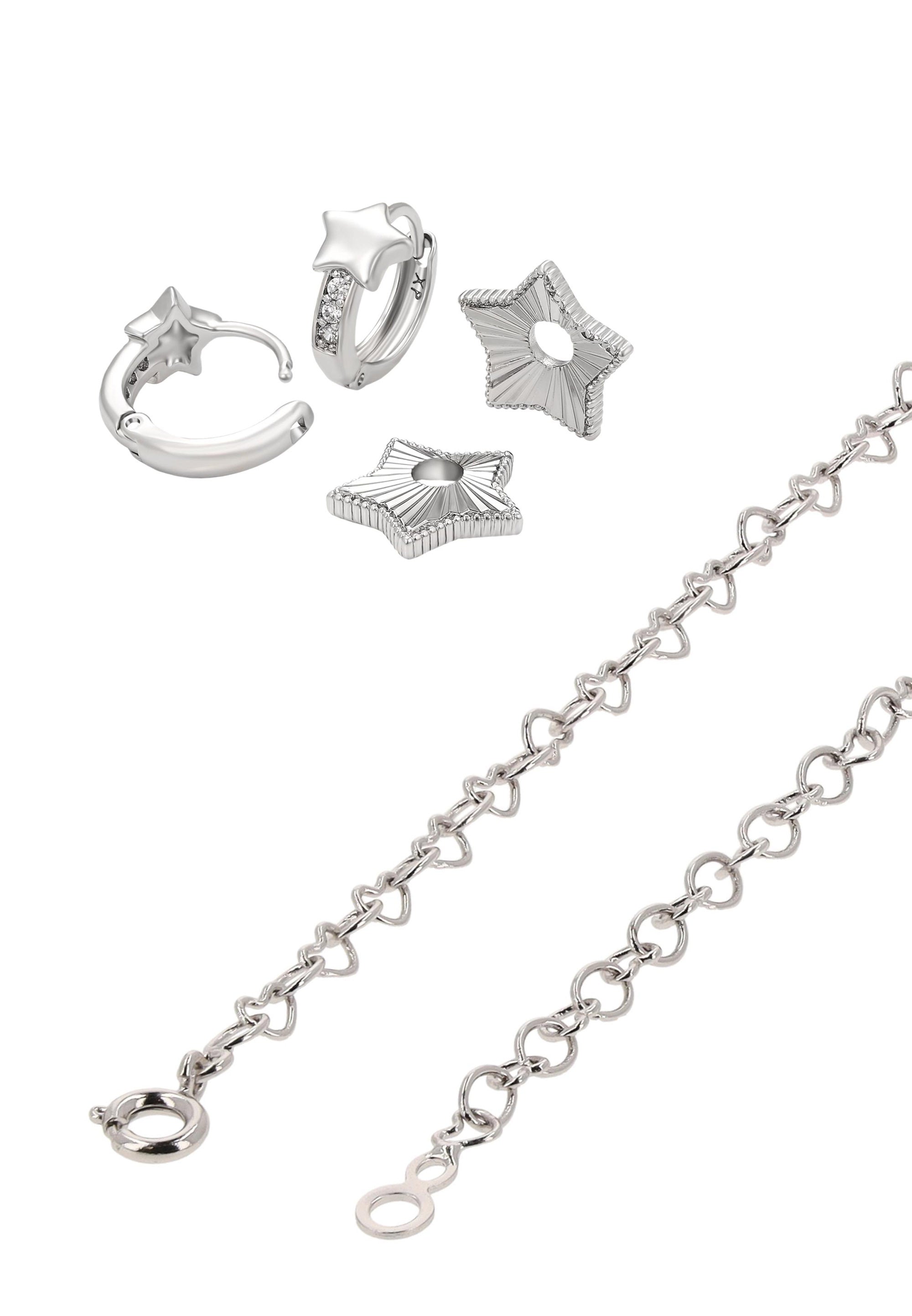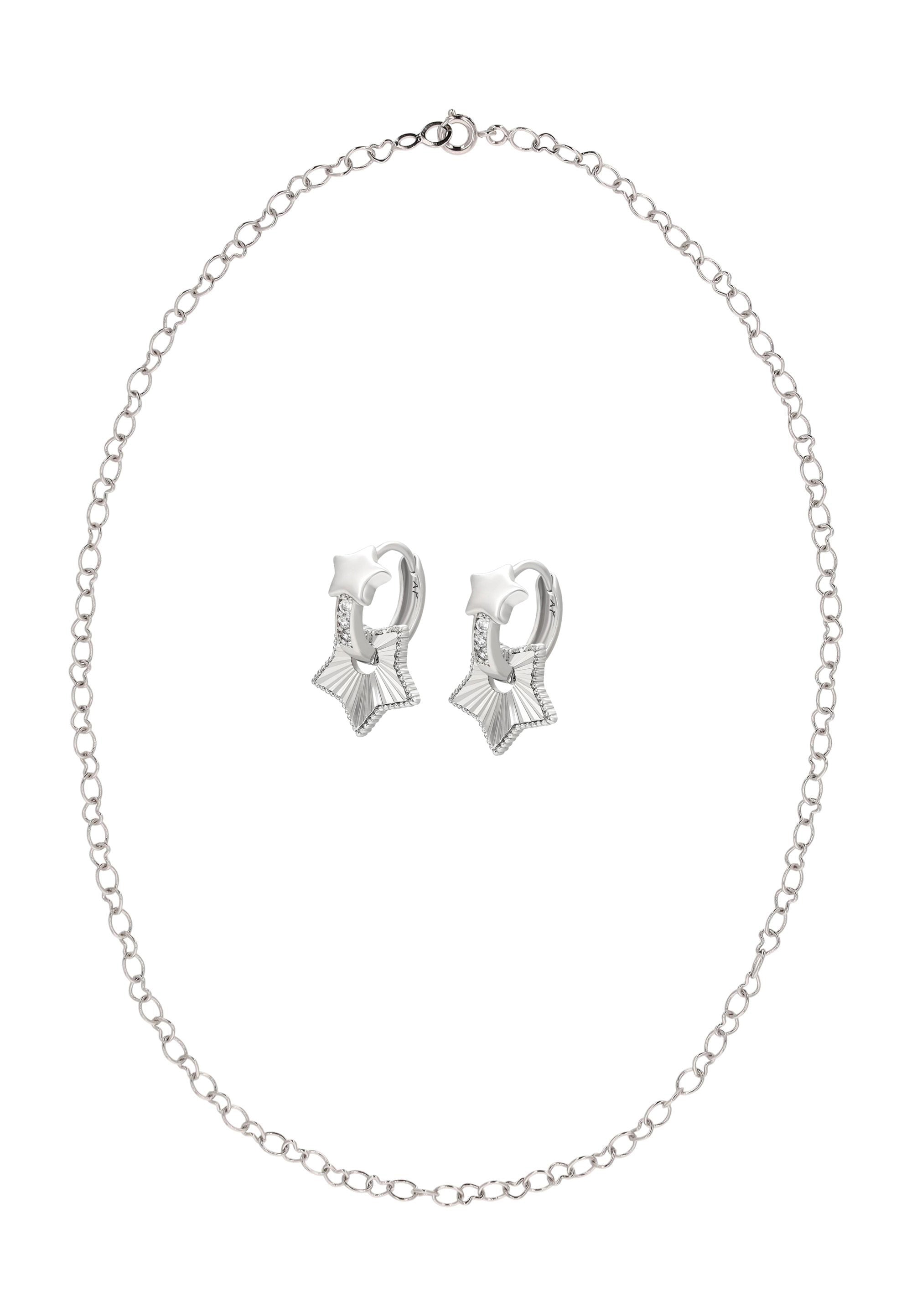 Fügen Sie mit diesem Schmuckset aus unserer Schmuckkollektion einen Hauch von himmlischem Charme hinzu. Dieses Halsketten- + Ohrring-Set ist aus Kupfer mit einem schlichten Muster gefertigt und verfügt über eine klassische Kette mit einem sicheren Karabinerverschluss. Die passenden Ohrringe zeigen ein zartes Sternmotiv und sind mit Klappverschlüssen für einen bequemen, zuverlässigen Sitz versehen. Elegant, vielseitig und zeitlos bringt dieses Set subtile Raffinesse sowohl in Alltagsoutfits als auch zu besonderen Anlässen.