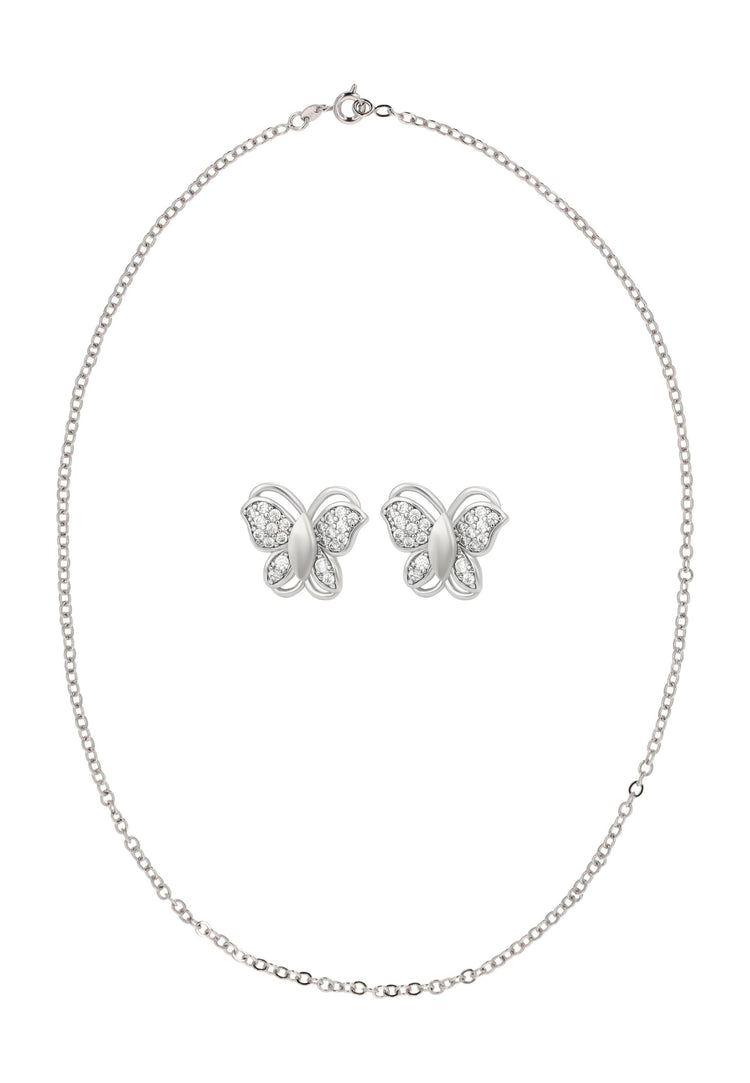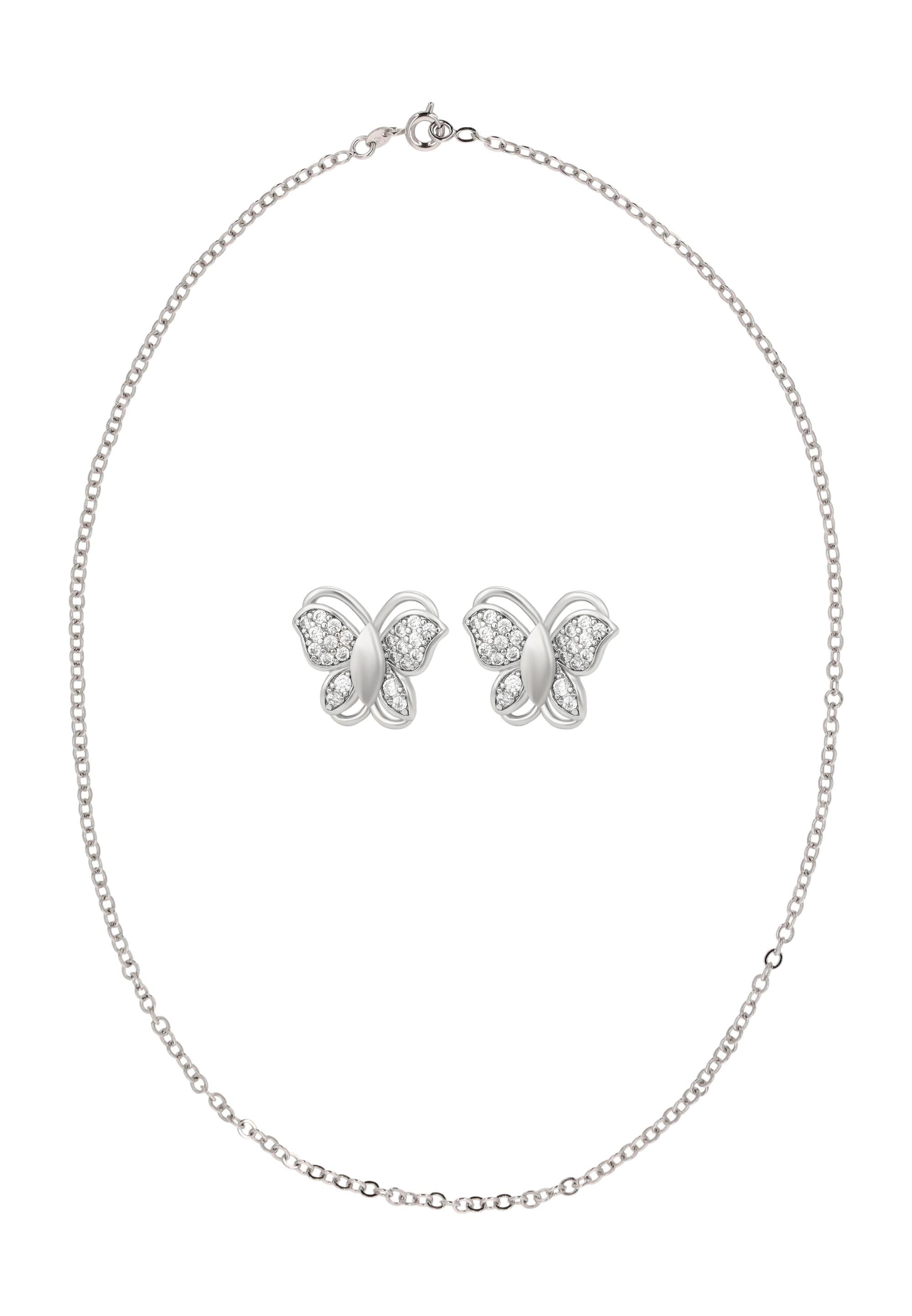 Bringen Sie verspielte Eleganz in Ihren Look mit diesem Schmuckset aus unserer Schmuckkollektion. Dieses Halsketten- + Ohrring-Set ist aus Kupfer mit einem schlichten Muster gefertigt und verfügt über eine klassische Kettenhalskette mit einem sicheren Karabinerverschluss. Die passenden Ohrstecker mit Schmetterlingsmotiv sind mit Strasssteinen verziert und mit Schmetterlingsverschlüssen für einen bequemen, zuverlässigen Sitz versehen. Elegant, vielseitig und zeitlos verleiht dieses Set sowohl Alltagsoutfits als auch besonderen Anlässen einen charmanten Glanz.