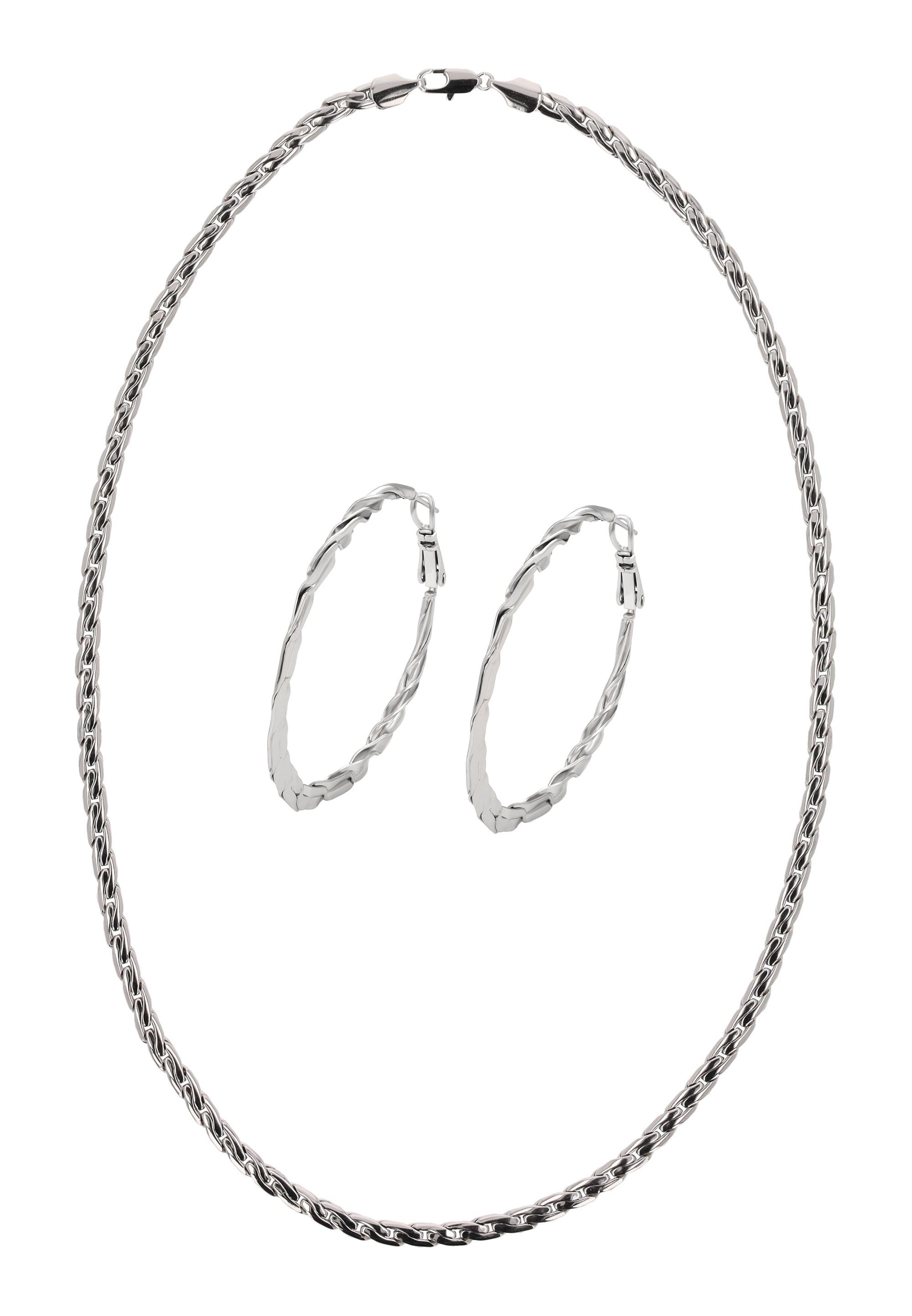 Verbessern Sie Ihren Stil mit diesem Schmuckset aus unserer Schmuckkollektion. Dieses Halsketten- + Ohrring-Set ist aus Kupfer mit einem schlichten Muster gefertigt und verfügt über eine Kettenhalskette mit einem sicheren Karabinerverschluss. Die passenden Creolen zeigen ein gedrehtes Design und Scharnierverschlüsse für einen bequemen Sitz. Elegant, vielseitig und zeitlos verleiht dieses Set klassischen Charme und Raffinesse sowohl Alltagsoutfits als auch besonderen Anlässen.