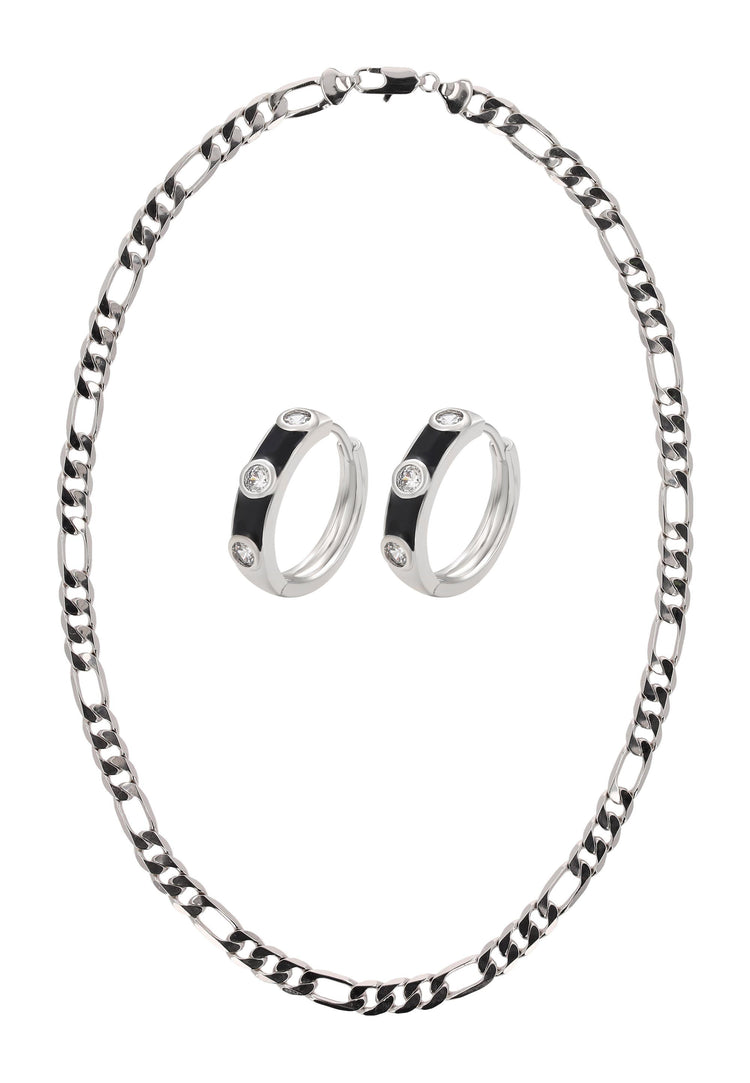 Fügen Sie mit diesem Schmuckset aus unserer Schmuckkollektion einen Hauch von feinem Glanz hinzu. Dieses Halsketten- + Ohrring-Set ist aus Kupfer mit einem schlichten Muster gefertigt und verfügt über eine Figarokette mit einem sicheren Karabinerverschluss. Die passenden Creolen sind zart mit Strasssteinen verziert und mit Scharnierverschlüssen für einen bequemen, zuverlässigen Sitz versehen. Elegant, vielseitig und zeitlos bringt dieses Set subtile Raffinesse sowohl in Alltagsoutfits als auch zu besonderen Anlässen.
