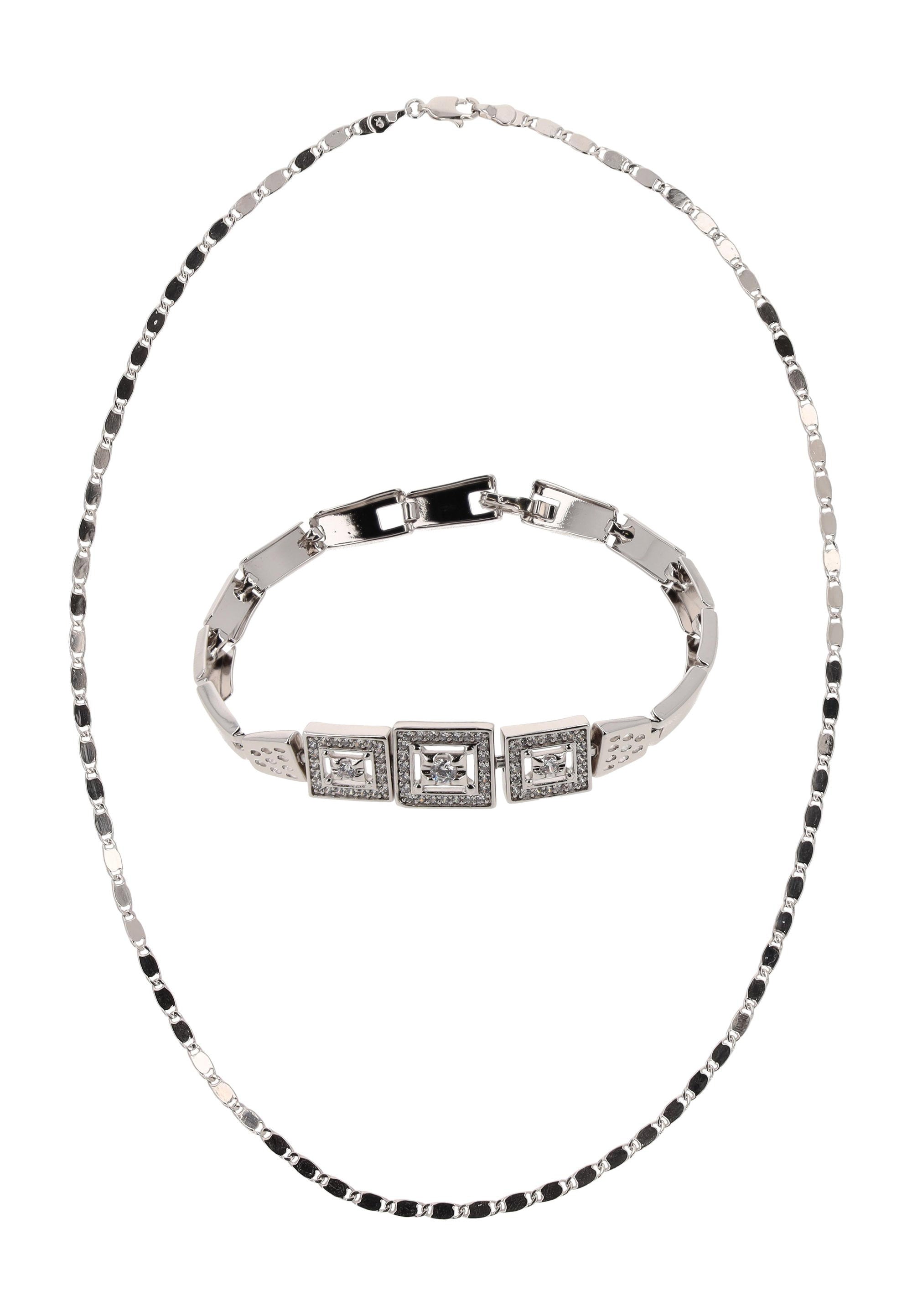 Fügen Sie strahlende Eleganz mit diesem Schmuckset aus unserer Schmuckkollektion hinzu. Dieses Halsketten- + Armband-Set ist aus Kupfer gefertigt und verfügt über ein glänzendes Muster, mit einer stilvollen Halskette mit Scheiben und einem sicheren Karabinerverschluss sowie einem passenden Gliederarmband, das mit Strasssteinen verziert ist und mit einem Klappverschluss abgeschlossen wird. Elegant, vielseitig und zeitlos bringt dieses Set einen Hauch von raffiniertem Glanz sowohl in den Alltag als auch zu besonderen Anlässen.