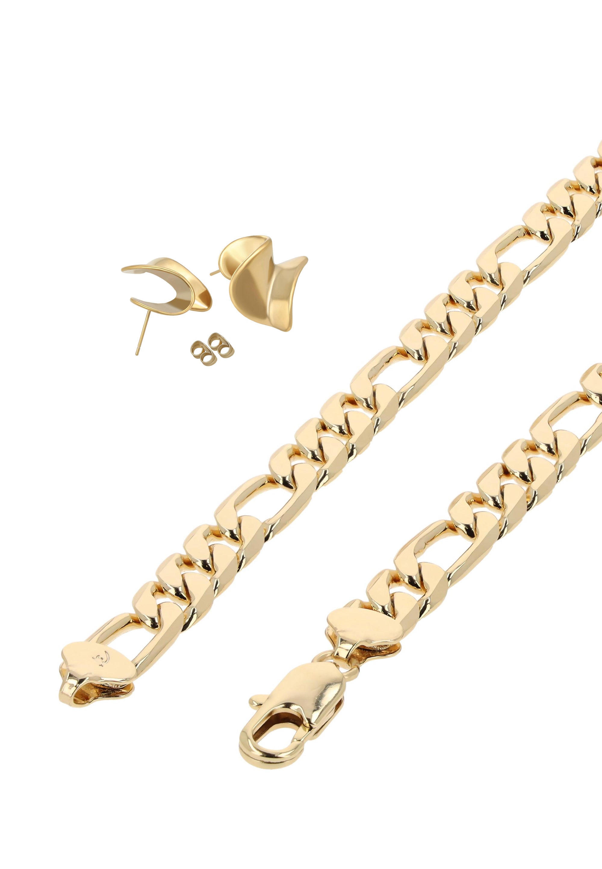Dieses elegante Schmuckset, bestehend aus einem Kettenarmband und Ohrringen, ist ein Klassiker mit zeitlosem Charakter. Das Armband im Figaro-Stil besticht durch seine harmonische Gliederanordnung und dezenten Schimmer, während der praktische Karabinerverschluss Komfort und Sicherheit gewährleistet. Die leichten Ohrringe mit Schmetterlingsverschluss ergänzen das minimalistische, schlanke Design des Sets perfekt. Die Materialmischung verleiht dem Set Haltbarkeit und ein elegantes Aussehen, wodurch es zu einem vielseitigen Accessoire für besondere Anlässe wird.