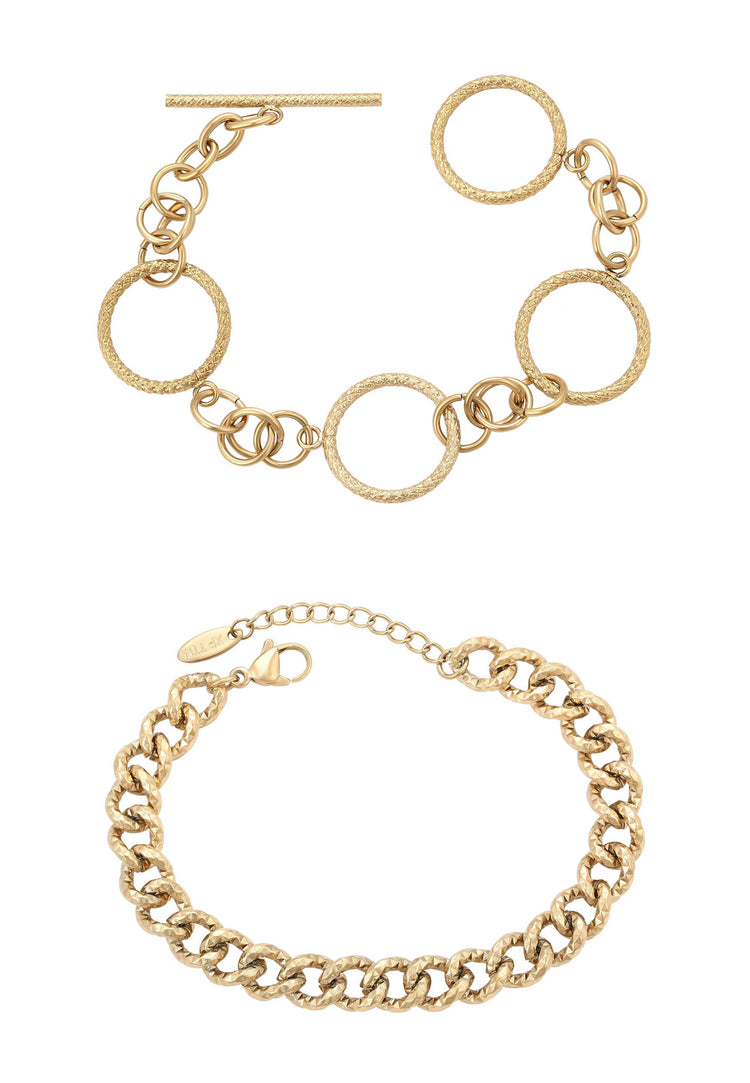 Entdecken Sie unser Schmuckset, das Eleganz mit zeitlosem Stil verbindet. Edelstahl-Kettenarmbänder garantieren Haltbarkeit und Widerstandsfähigkeit gegen den täglichen Gebrauch. Knebel- und Karabinerverschlüsse sorgen für Komfort und Sicherheit, während das strukturierte Muster eine einzigartige Note verleiht. Diese zeitlosen und vielseitigen Armbänder sind perfekt für sowohl legere als auch elegante Outfits.