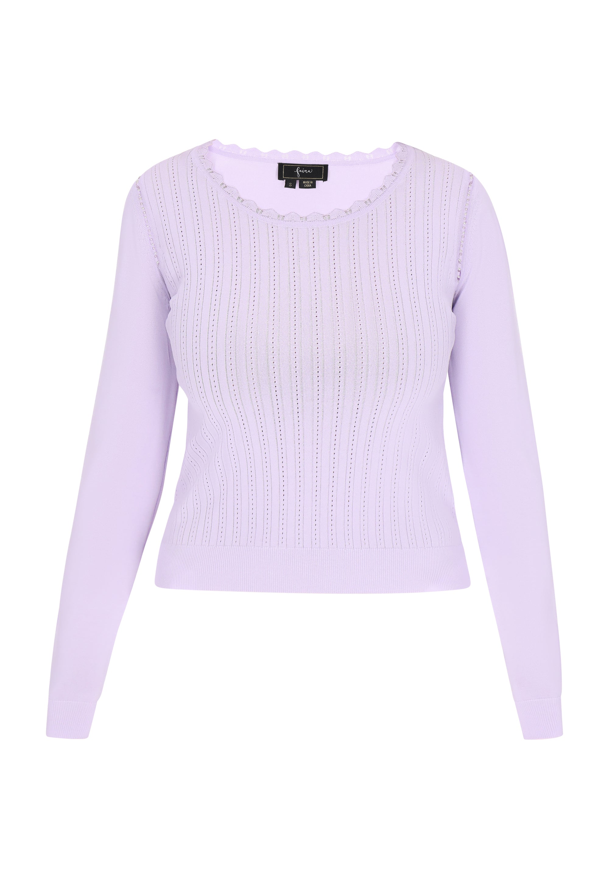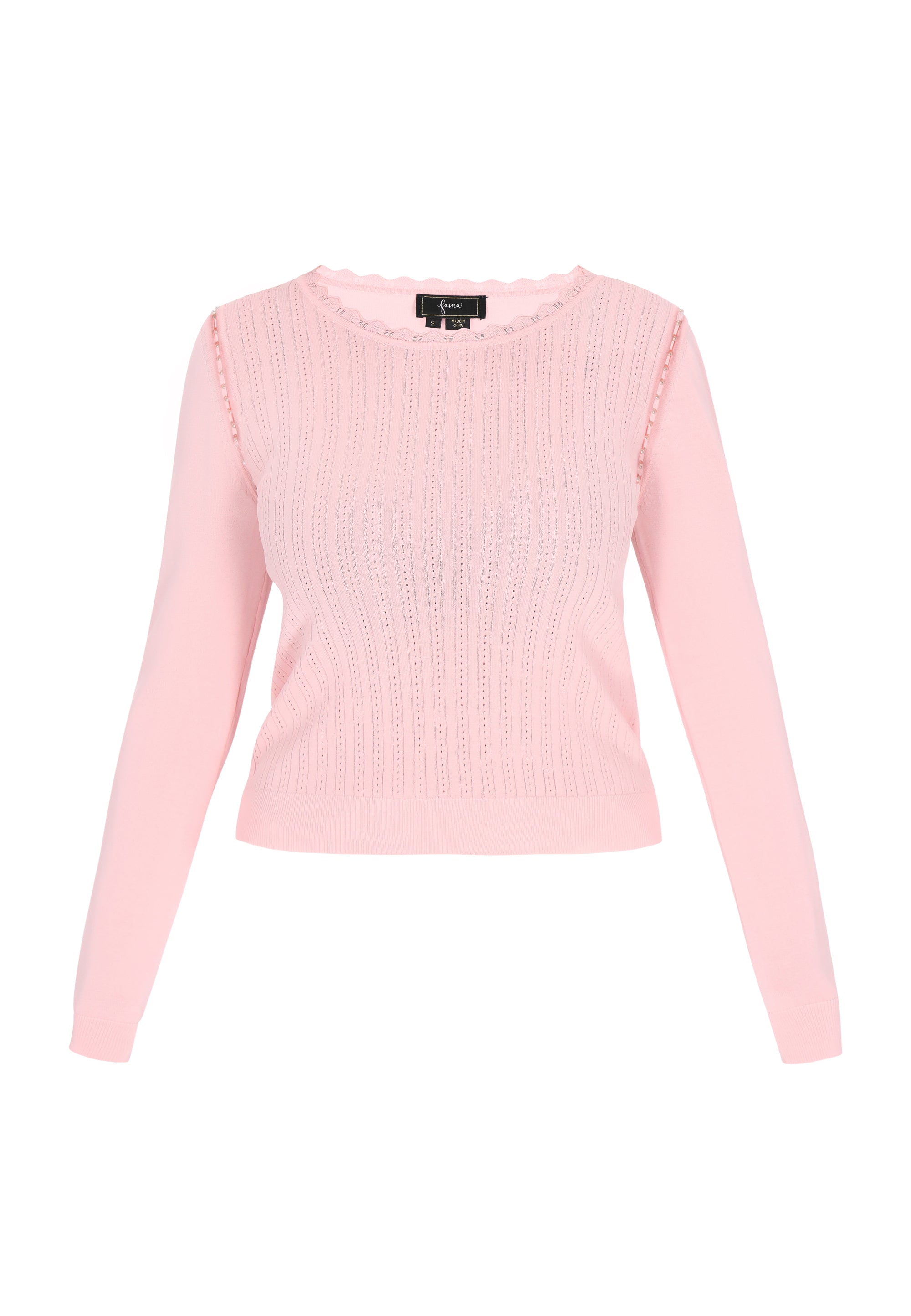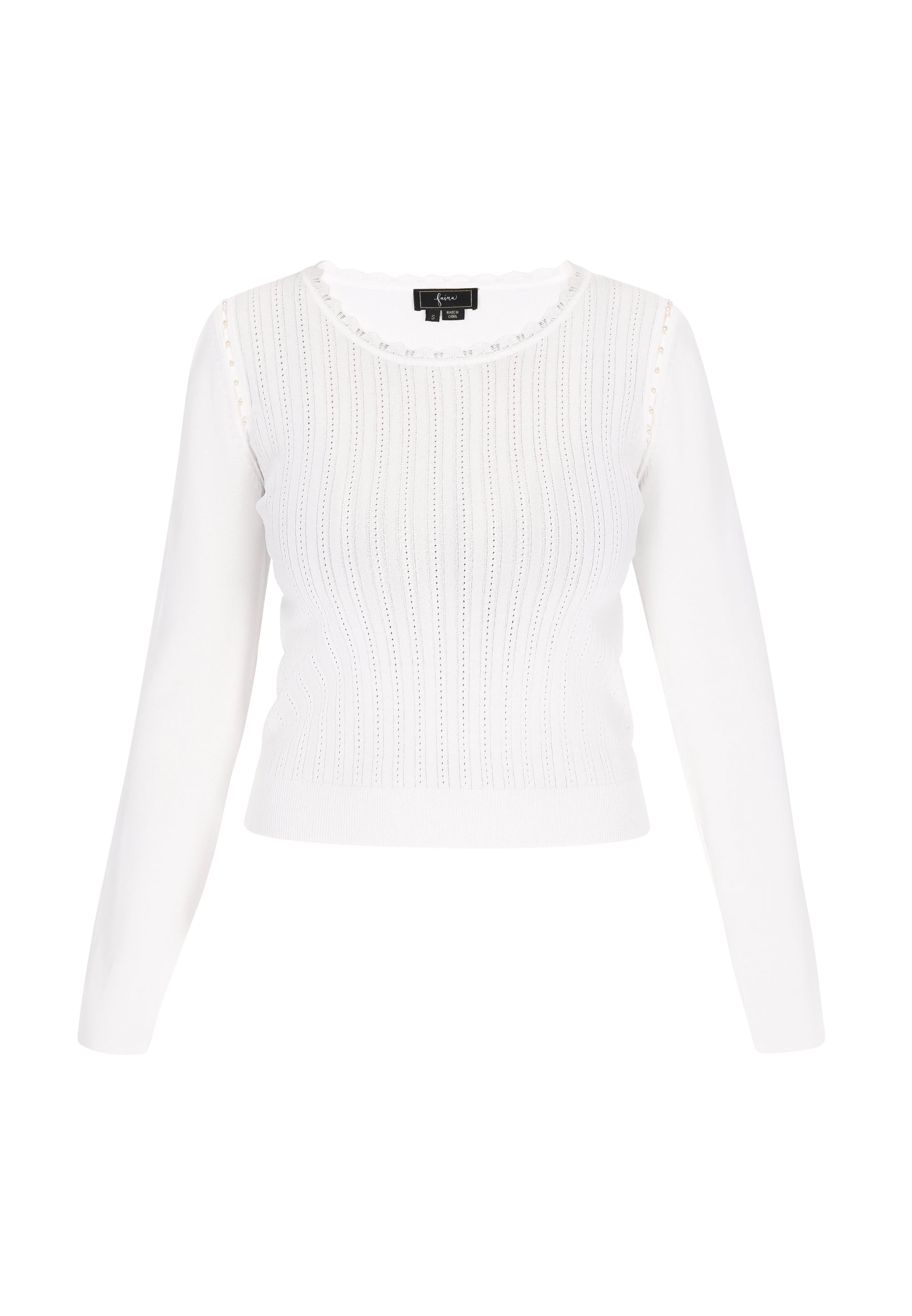 Odkryj ten elegancki sweter o regularnym kroju z okrągłym dekoltem, który ma falbankowe wykończenie. Z długimi rękawami ozdobionymi perłowymi wycięciami. Dzianinowy ażurowy wzór podkreśla jego casualowy charakter, czyniąc go idealnym na co dzień. To niezbędny element garderoby dla miłośników mody ceniących komfort i styl. Jest częścią kolekcji Comfortable Collection.