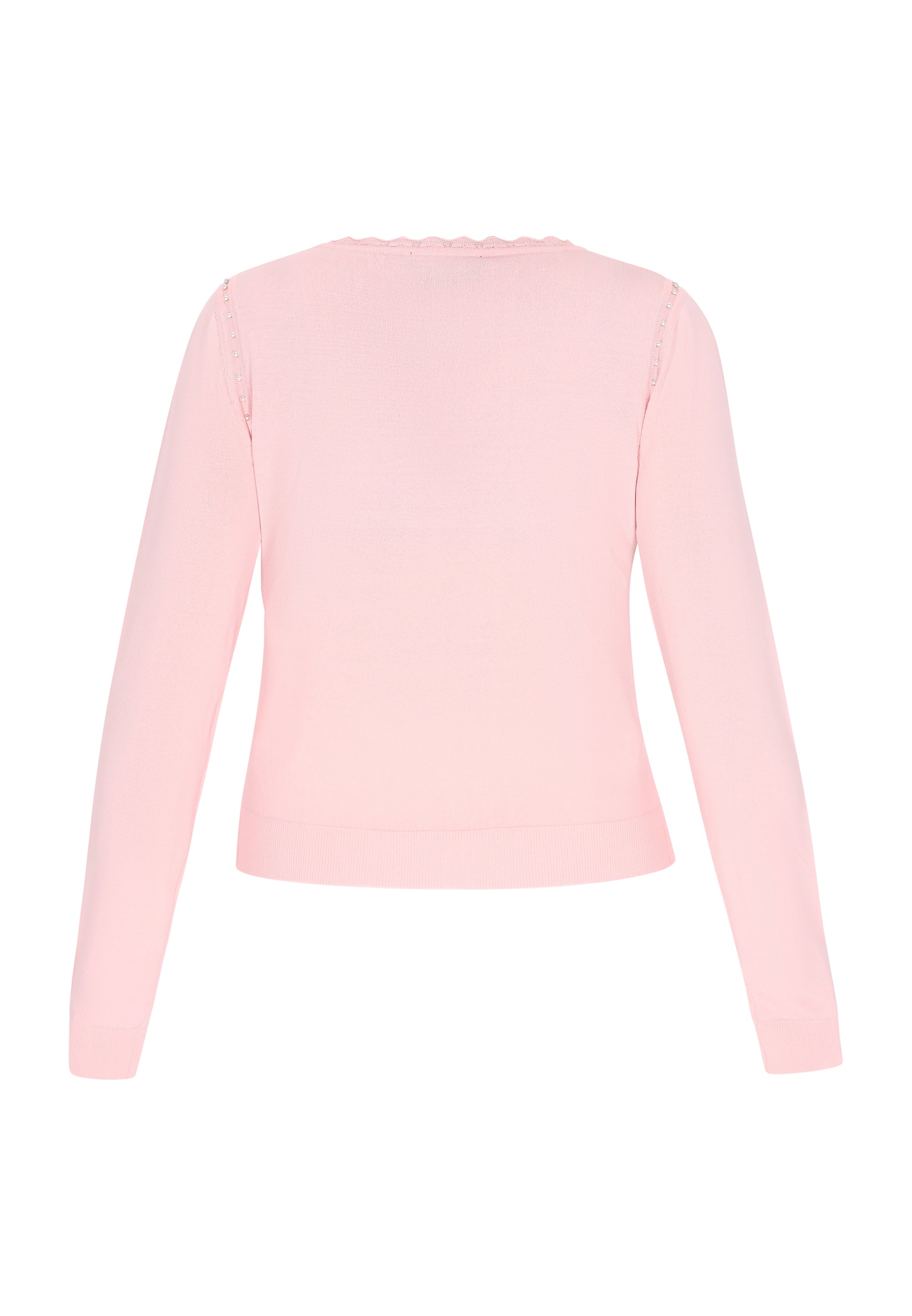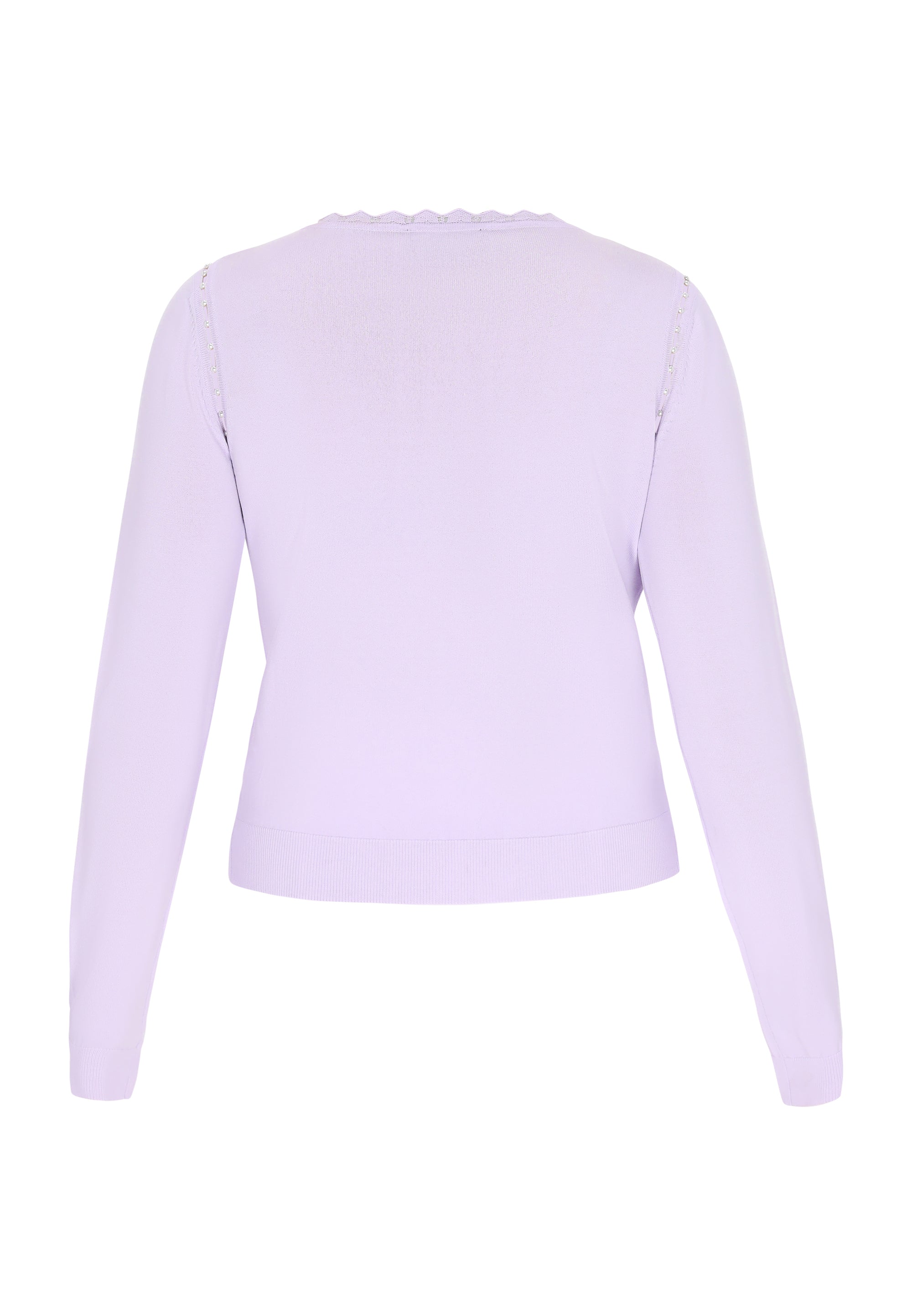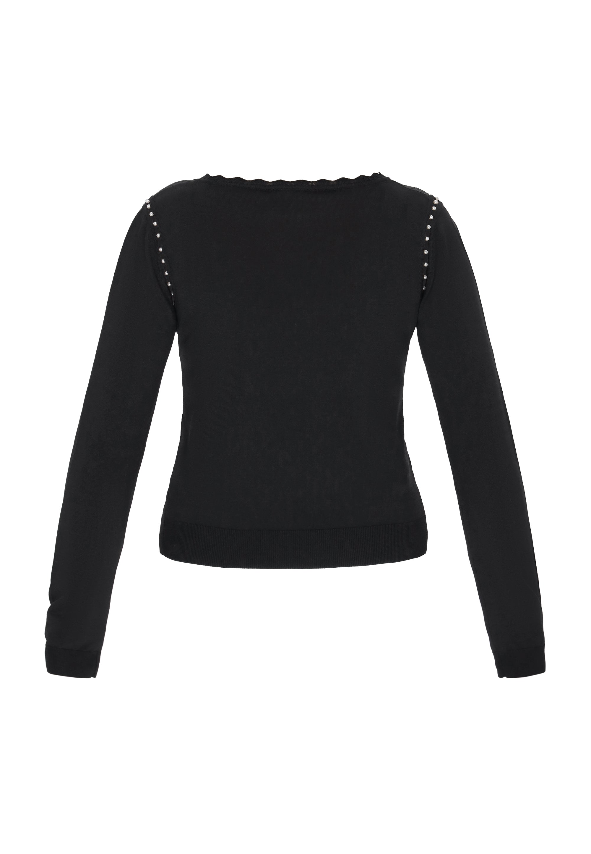 Odkryj ten elegancki sweter o regularnym kroju z okrągłym dekoltem, który ma falbankowe wykończenie. Z długimi rękawami ozdobionymi perłowymi wycięciami. Dzianinowy ażurowy wzór podkreśla jego casualowy charakter, czyniąc go idealnym na co dzień. To niezbędny element garderoby dla miłośników mody ceniących komfort i styl. Jest częścią kolekcji Comfortable Collection.