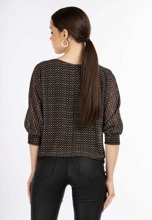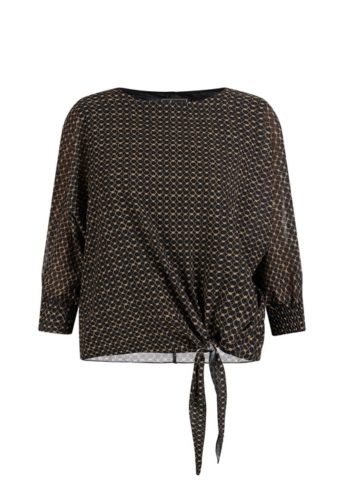 Z eleganckim, czarno-złotym nadrukiem na całej powierzchni, bluzka od faina jest akcesorium na każdą okazję. Wykonana z jedwabistego, błyszczącego materiału, jest bardzo wygodna w noszeniu, a szerokie rękawy typu batwing z marszczonymi mankietami nadają jej świeżego charakteru. Prosty dół staje się przyciągającym wzrok detalem dzięki węzłowi.