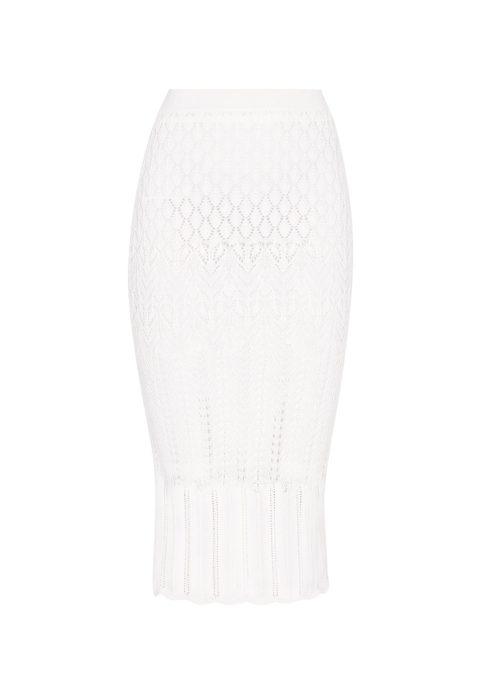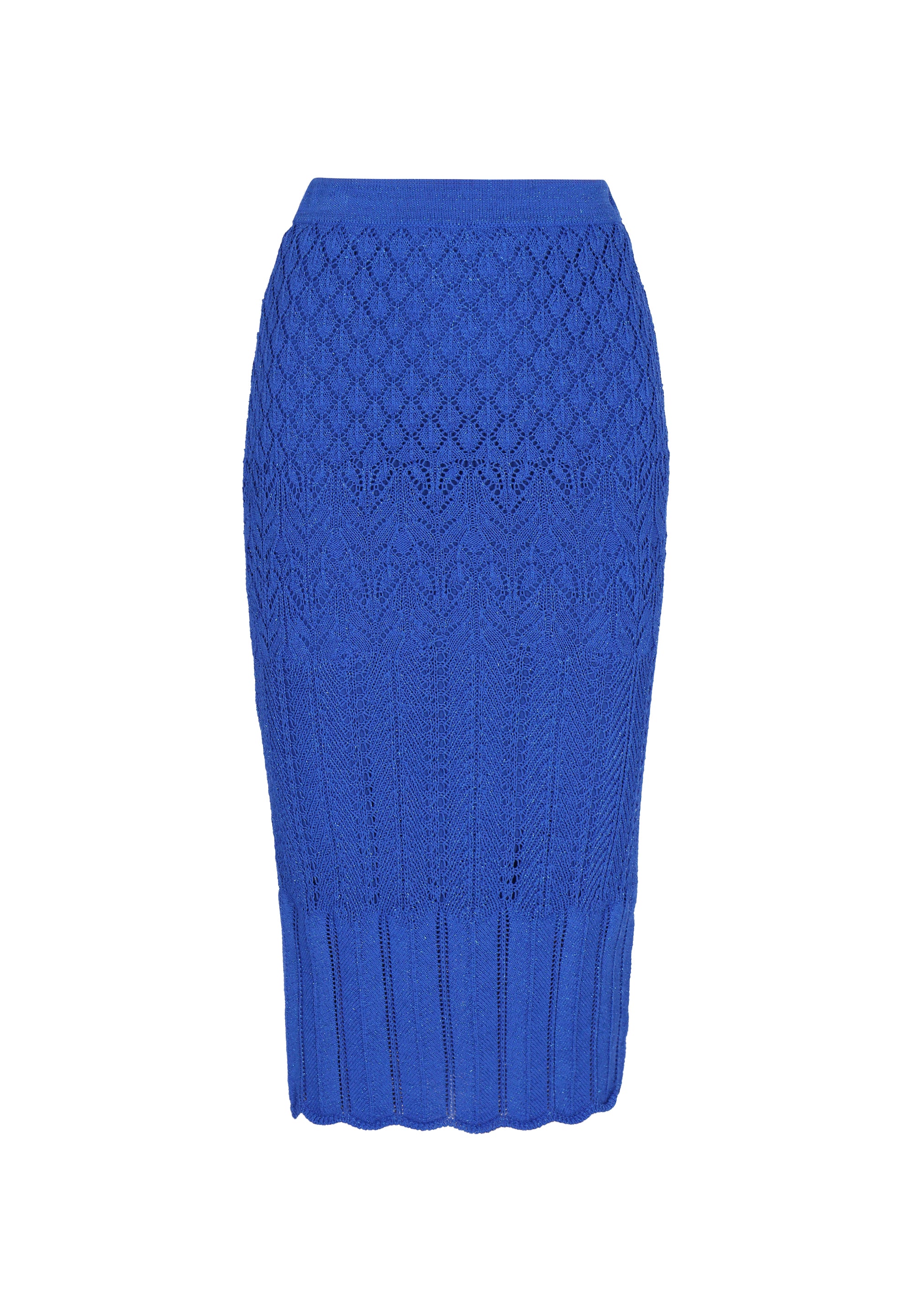 Keyword: wzór ajour, codzienny, wygodny, moda na co dzień, kolekcja modnych stylizacji, dzianinowy, metaliczna nić, midi, spódnica, dopasowany krój, stylowy