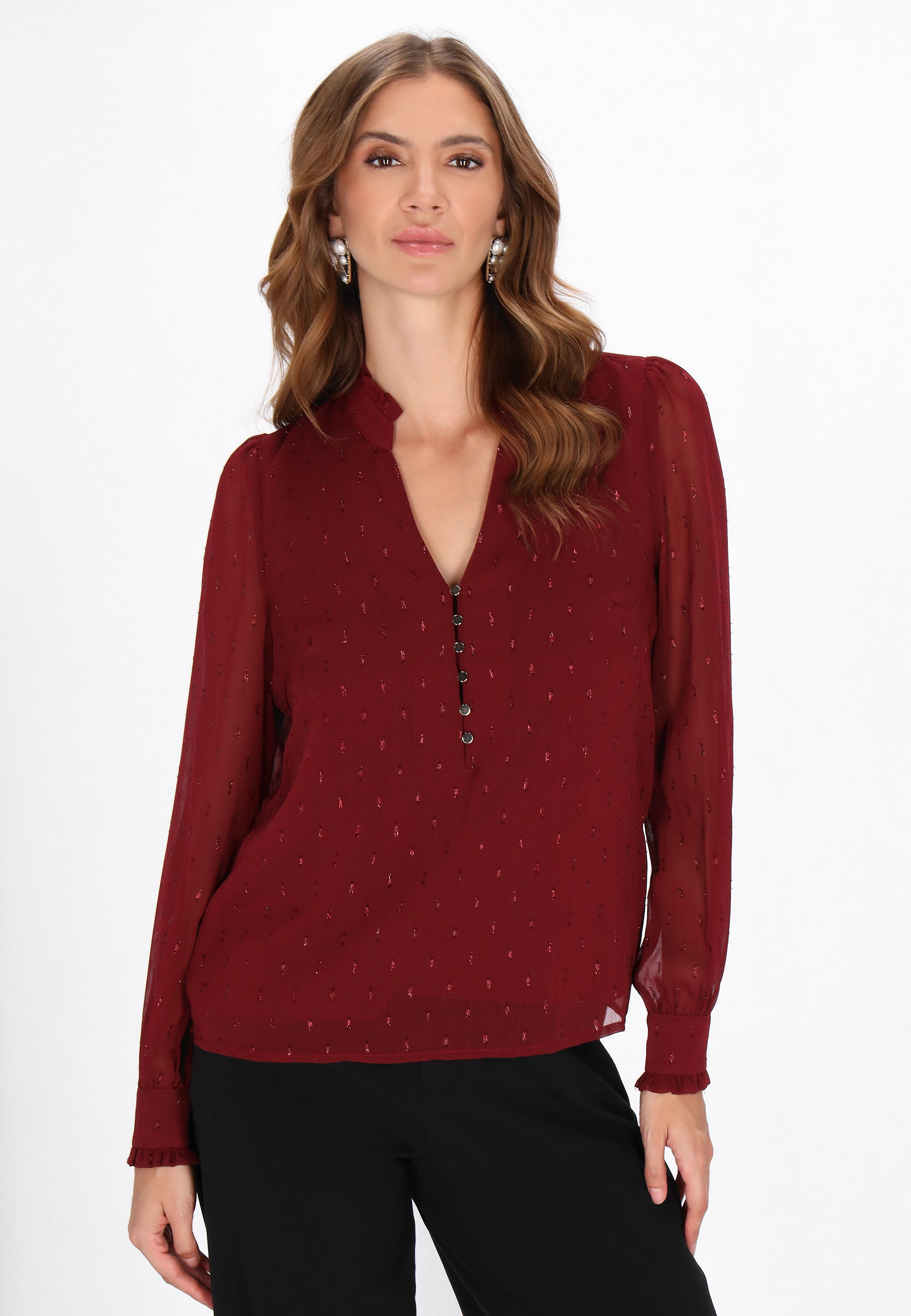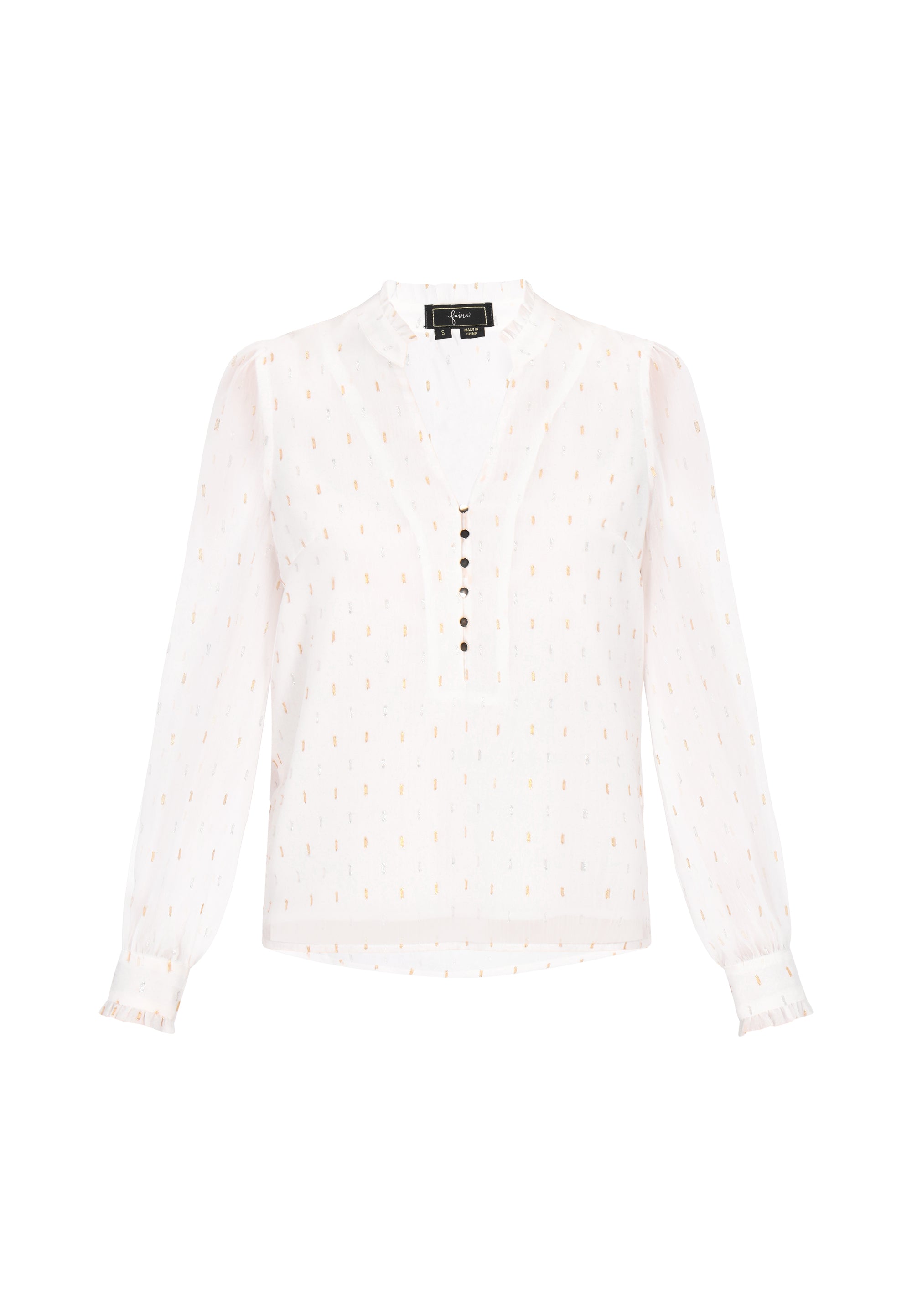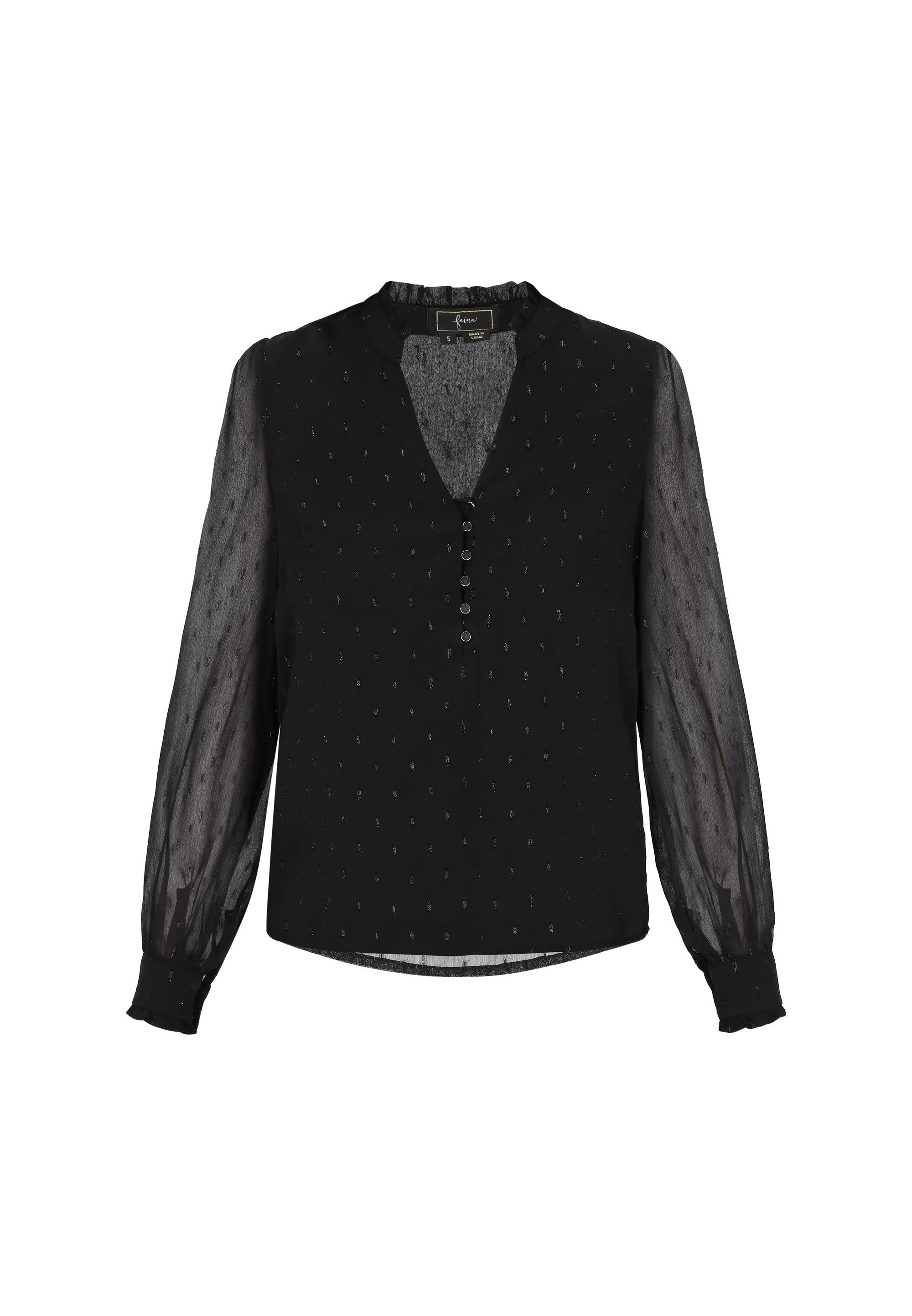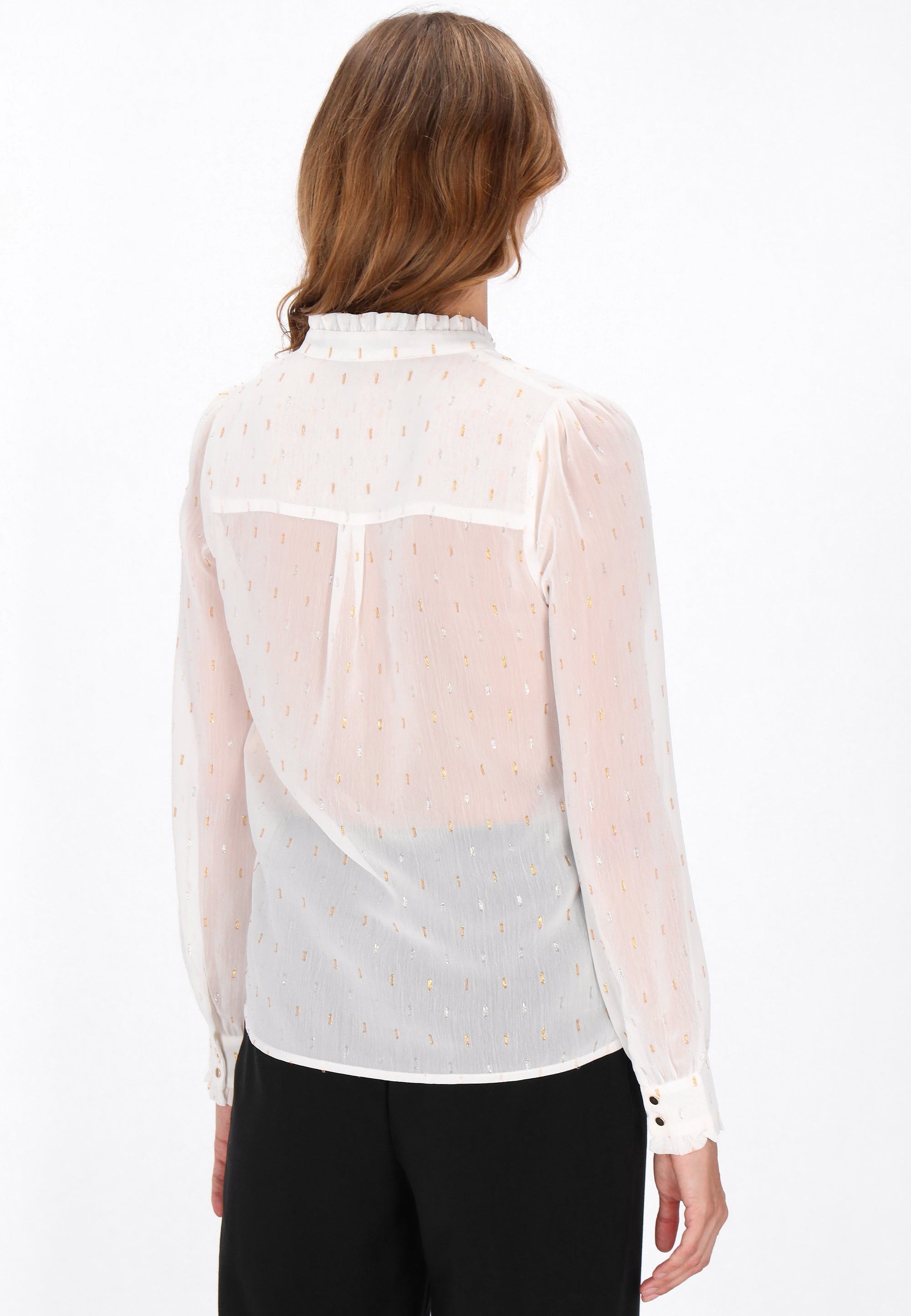 Ta bluzka o regularnym kroju z dekoltem w serek i falbanianym kołnierzem emanuje kobiecym urokiem i ponadczasowym stylem. Wykonana z lekkiego szyfonu z subtelnym wzorem w kropki, ozdobiona jest dekoracyjnymi guzikami. Długie bufiaste rękawy dodają romantycznego akcentu, a przewiewna tkanina zapewnia komfort. Idealna do codziennych, a zarazem eleganckich stylizacji z klasycznym akcentem. Ta bluzka jest częścią kolekcji Fashion Look.