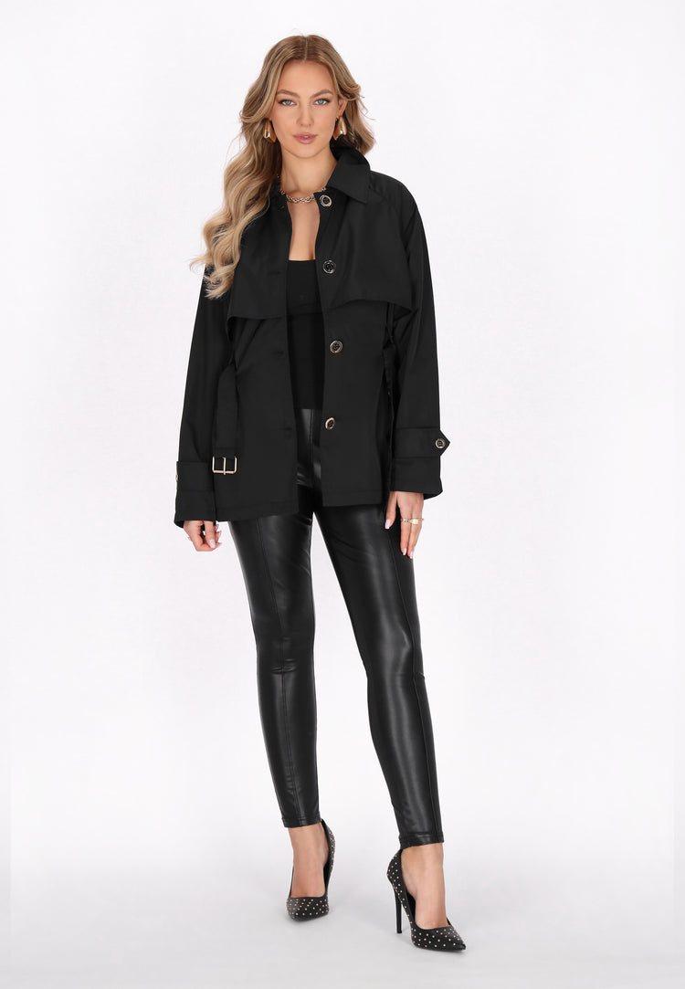 Odkryj szykowny, krótki płaszcz zaprojektowany dla miłośników mody z kolekcji Outwear. Ten stylowy płaszcz ma regularny krój, klasyczny kołnierz oraz długie rękawy raglanowe z mankietami na guziki. Zapięcie na guziki z przodu i sznurek w talii tworzą korzystną sylwetkę. Dzięki praktycznym bocznym kieszeniom i lekko rozkloszowanemu dołowi, ten płaszcz to niezbędny element Twojej szykownej garderoby.