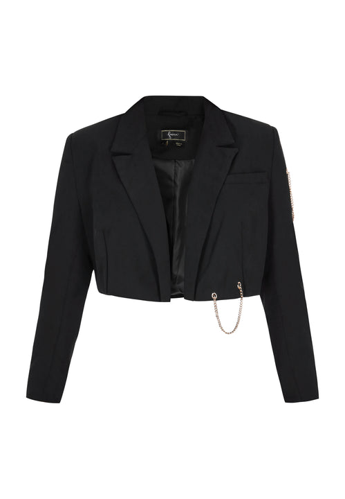 Podkreśl swój styl dzięki tej eleganckiej, krótkiej marynarce o regularnym kroju. Klasyczny kołnierz z klapami i pojedyncze zapięcie na guzik podkreślają jej szykowny wygląd. Posiada długie rękawy, kieszeń na piersi oraz tkaninę o splocie, a także ozdobne łańcuchy, które dodadzą szykownego akcentu każdej miłośniczce mody. Idealna na stylowe wydarzenia! Jest częścią kolekcji Fashion Look.