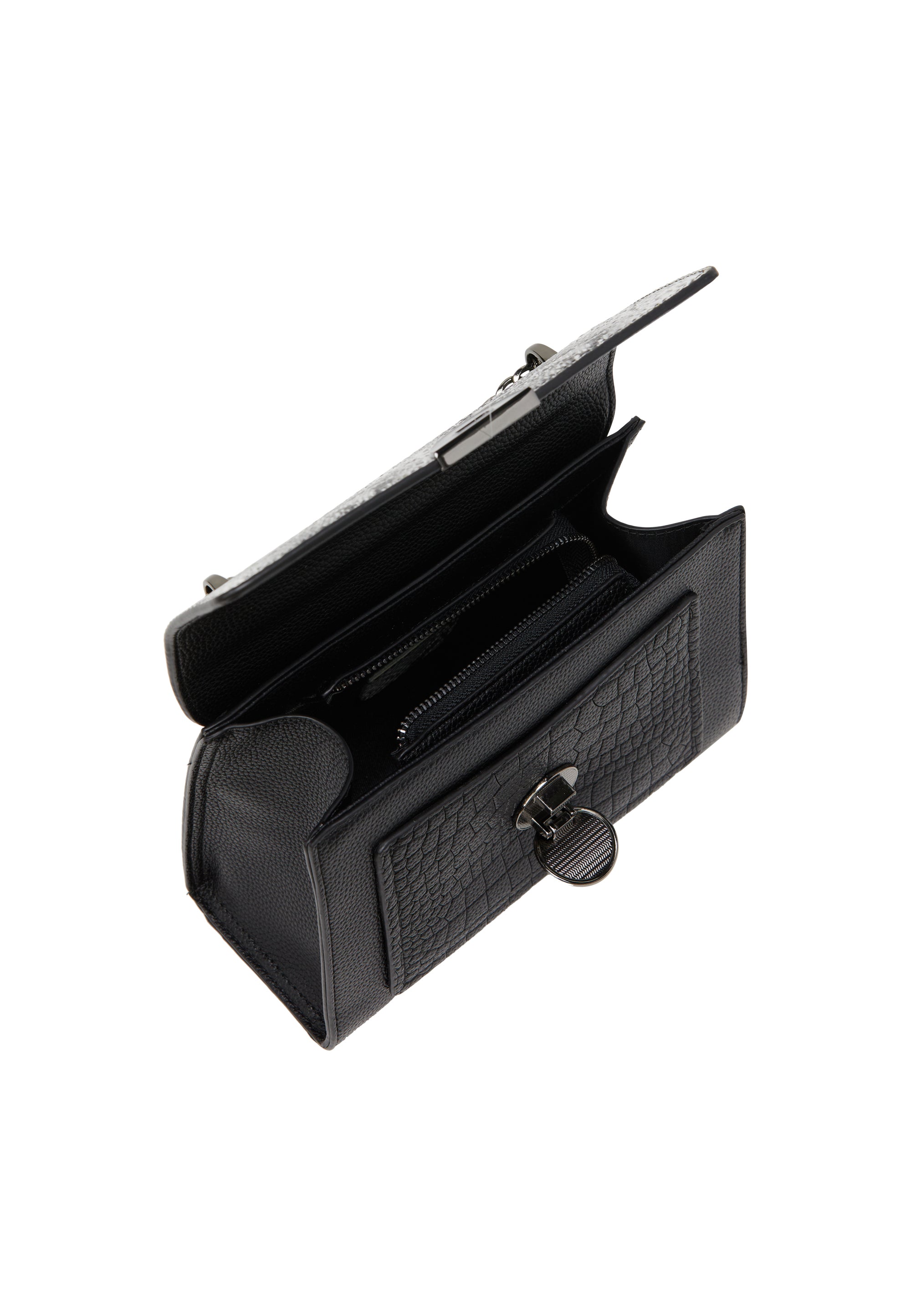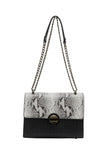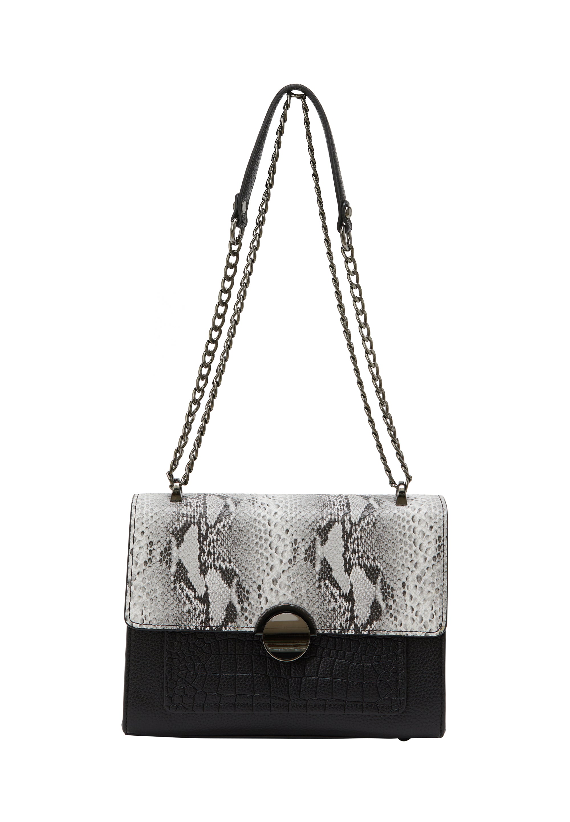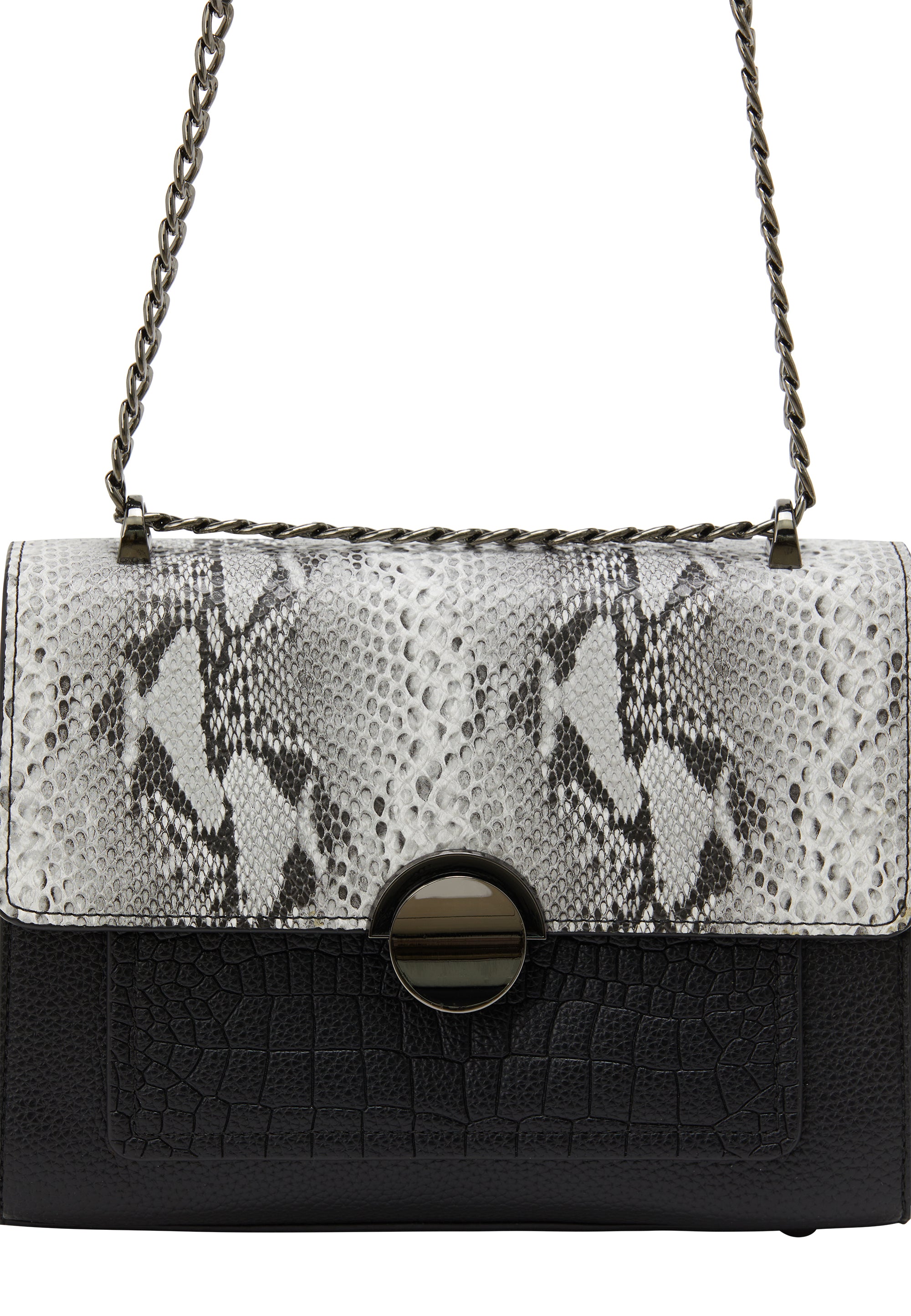 Odkryj wyrafinowaną torebkę z klapką z wzorem aligatora na dolnej części oraz fakturą skóry węża na przodzie. Okrągłe zapięcie zapewnia bezpieczne zamknięcie, a podwójny łańcuszkowy pasek oferuje komfort podczas eleganckich okazji. Ta prostokątna torebka posiada przestronne wnętrze oraz wewnętrzną kieszeń na zamek na Twoje osobiste przedmioty.