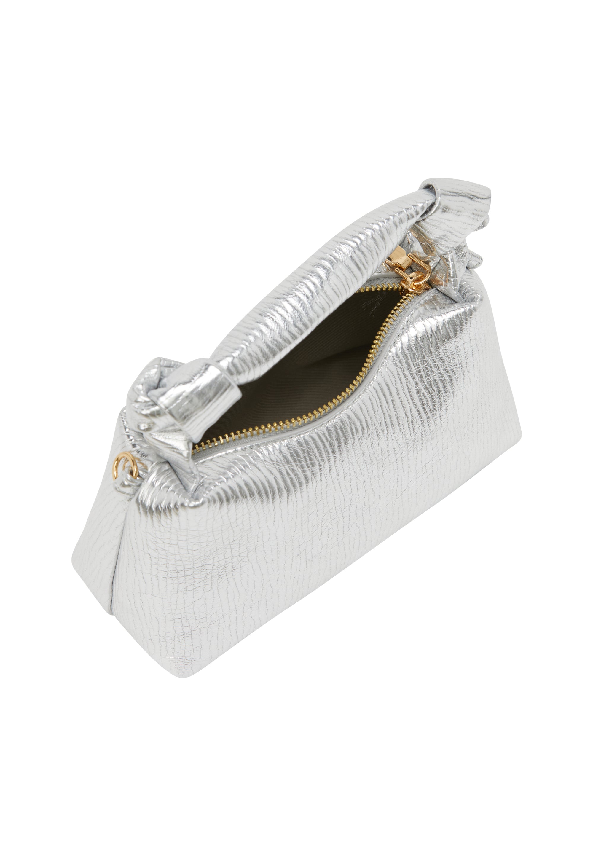 Podnieś swój styl dodatków dzięki tej usztywnianej torebce z elegancką, pogniecioną fakturą i stylowym, supełkowanym uchwytem. Bezpieczne zamknięcie na zamek błyskawiczny zapewnia łatwy dostęp, a smukły design w jednolitym kolorze sprawia, że jest idealna na każdą okazję. Wyposażona w metalowe okucia i dodatkowy łańcuszek, jest doskonała na imprezy!