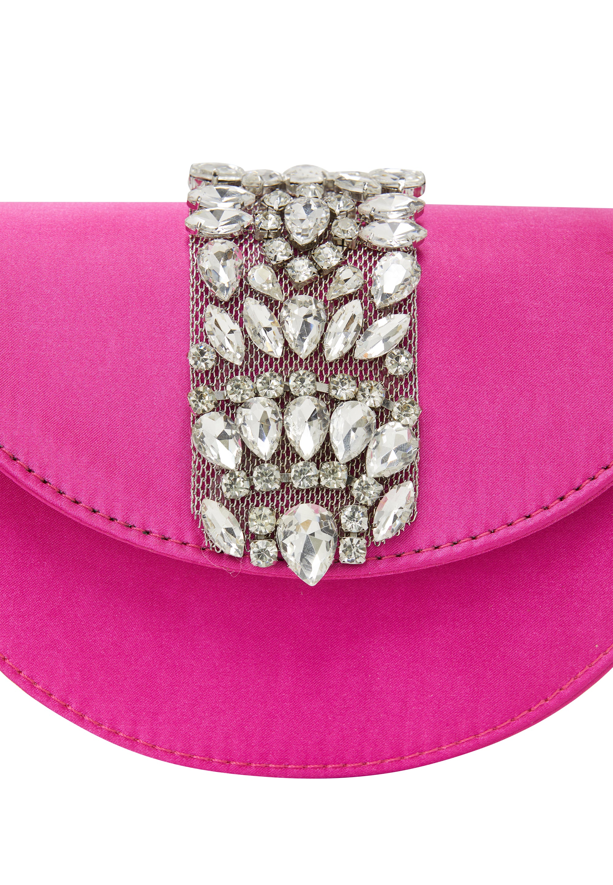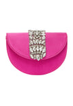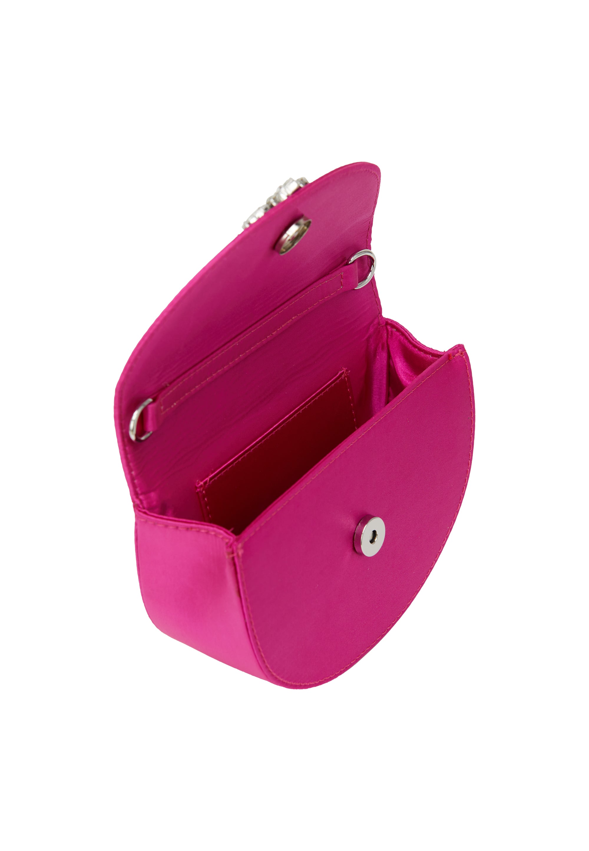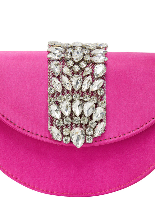 Podnieś swój wieczorowy strój dzięki tej eleganckiej kopertówce, prezentującej szykowny półksiężycowy kształt ozdobiony oszałamiającym wzorem diamentowym. Idealna na formalne wydarzenia, zawiera dodatkowy łańcuszek dla większej wszechstronności. Stylowa klapka otwiera się, odsłaniając wewnętrzną kieszeń, która pozwala utrzymać porządek w niezbędnikach, emanując jednocześnie wyrafinowaniem i urokiem.