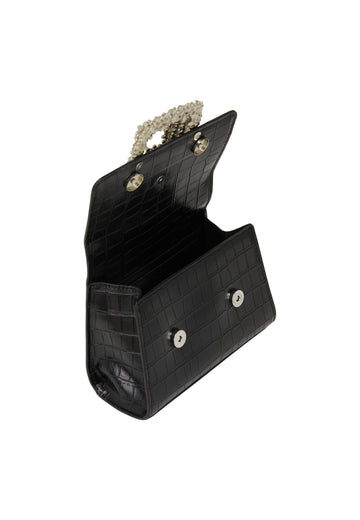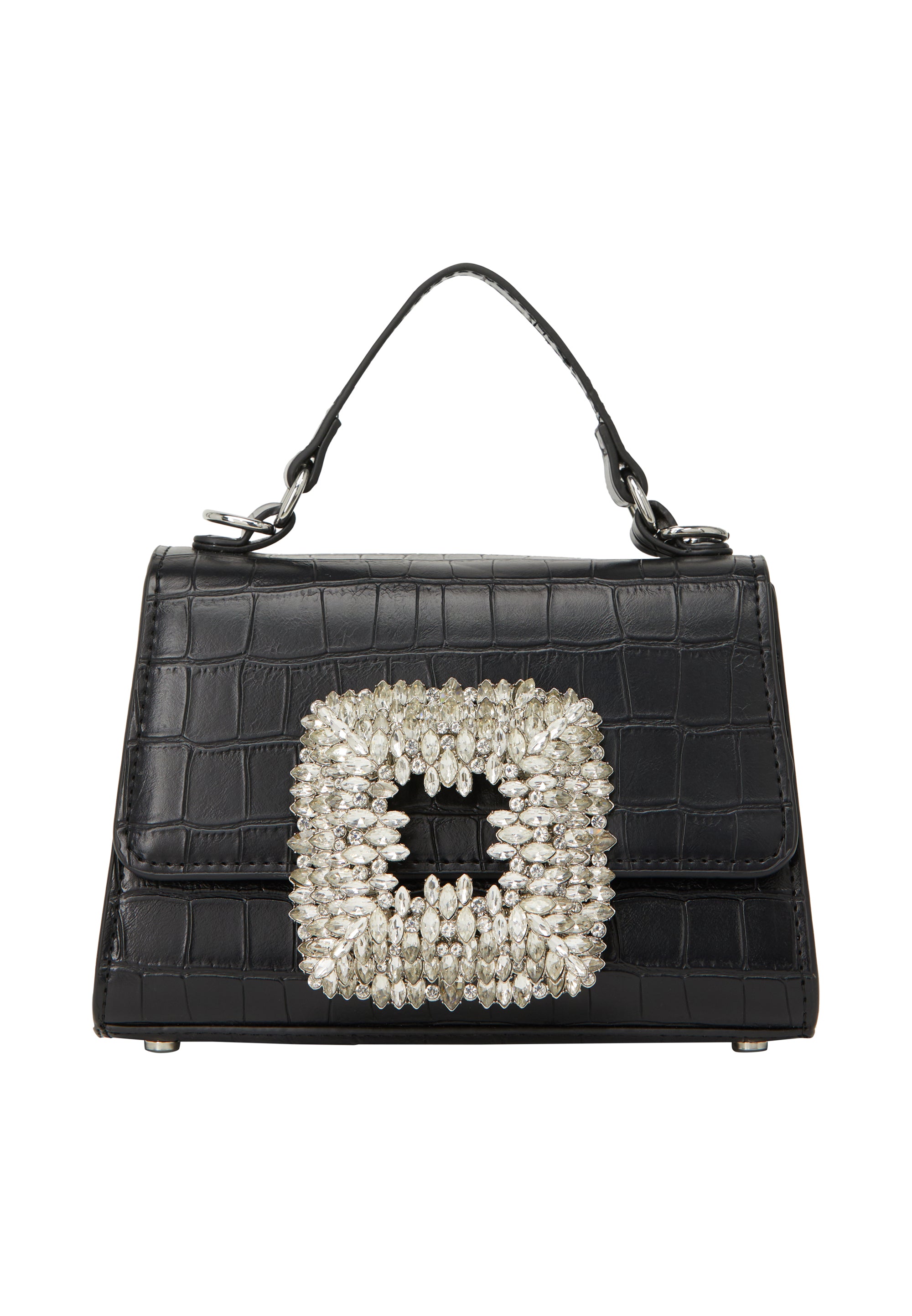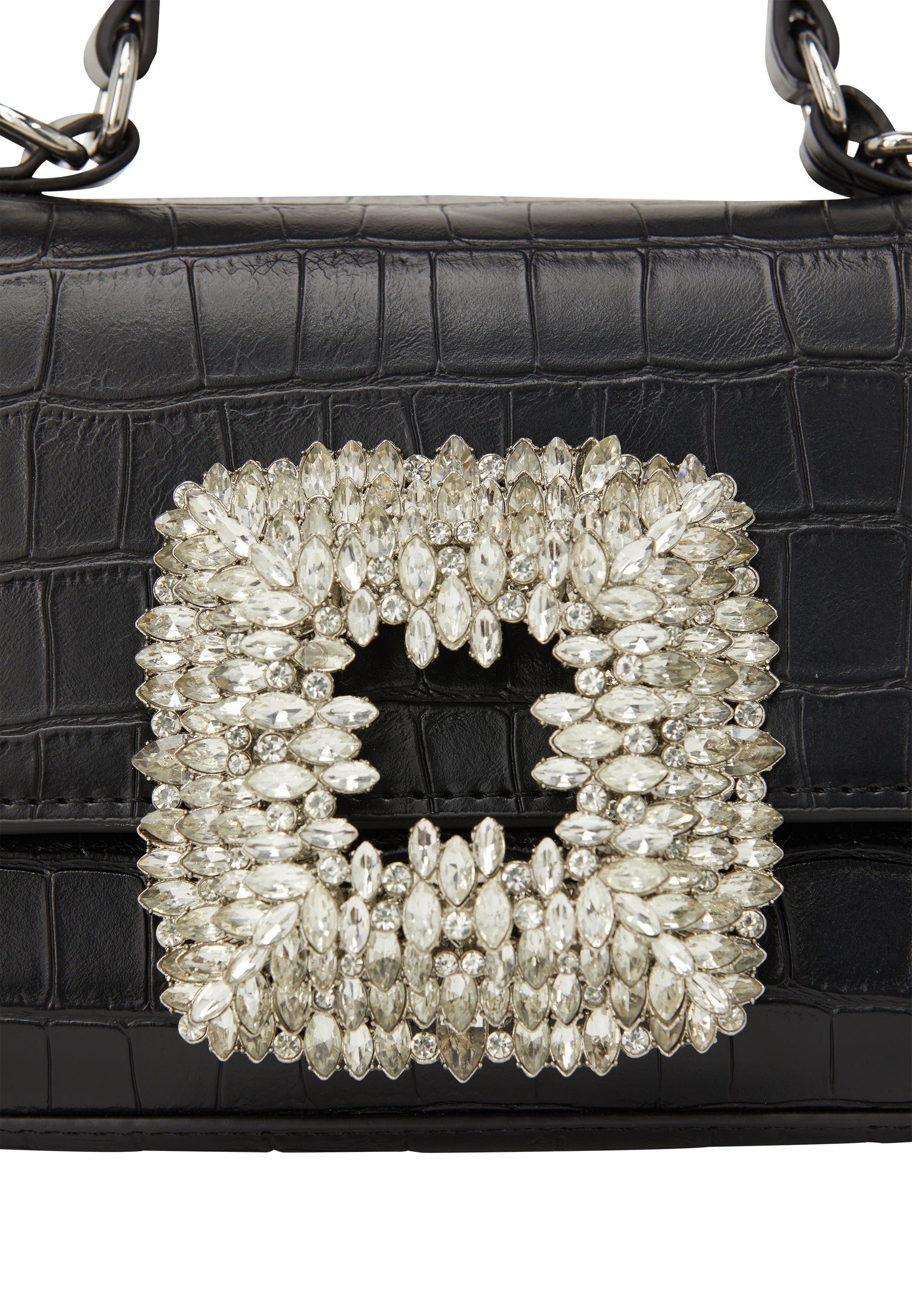Podkreśl swój styl dzięki tej usztywnianej torebce, prezentującej elegancki, prostokątny kształt oraz stylowe zapięcie na klapę ozdobione w centrum. Wzór diamentowy dodaje wyrafinowania, a teksturowana powierzchnia imituje skórę gadów. Dzięki dodatkowym łańcuszkowi dla wszechstronności oraz wewnętrznej kieszeni na niezbędne drobiazgi, jest idealna na każdą imprezę.