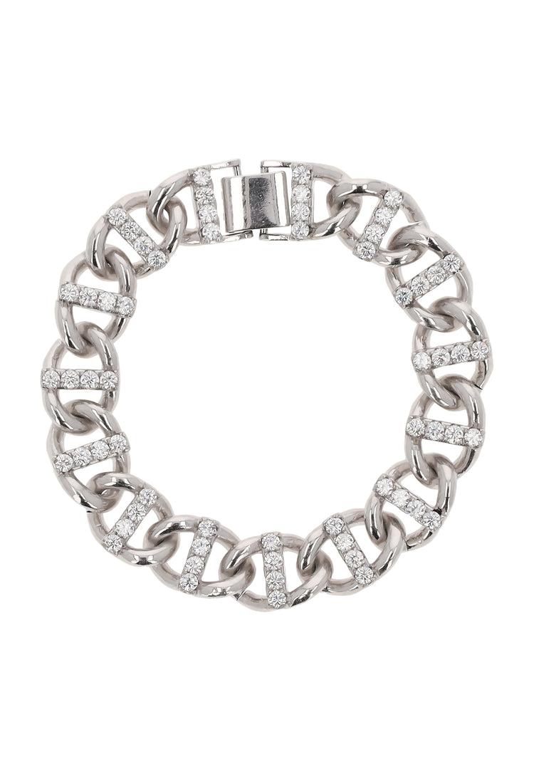 Uderzająca i ponadczasowa bransoletka z ogniw łańcucha wykonana z wysokiej jakości miedzi, łącząca elegancję z charakterystycznym stylem. Jej klasyczny, prosty design zdobią subtelnie błyszczące kamienie cyrkonii, dodające blasku każdej stylizacji. Zapięcie na zatrzask zapewnia komfort i bezpieczeństwo. Idealna na specjalne okazje, łącząc elegancję z nutą wyrazistego szyku. Jest częścią Kolekcji Biżuterii.