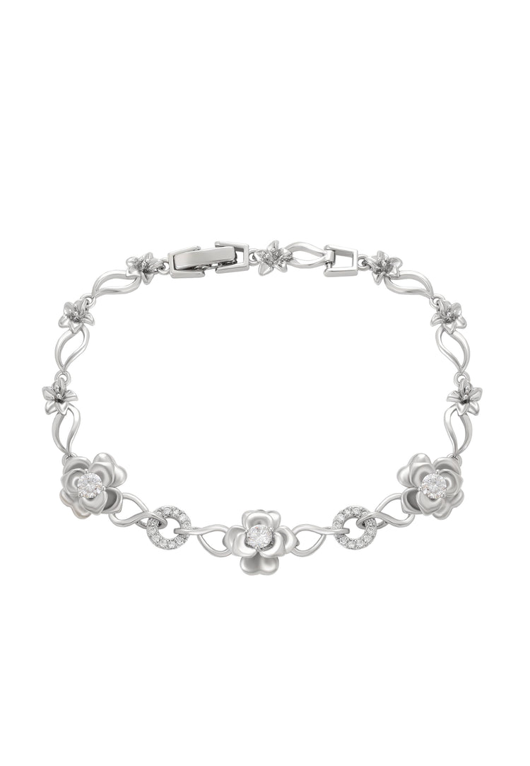 Odkryj tę elegancką bransoletkę, ozdobioną kwiatowym wzorem i okrągłymi ogniwami z kryształami. Zapięcie na zatrzask zapewnia bezpieczne dopasowanie, podczas gdy migoczący, błyszczący design podkreśla misternie wykonane detale. Ten ponadczasowy element emanuje kobiecością i urokiem. Część naszej Kolekcji Biżuterii.