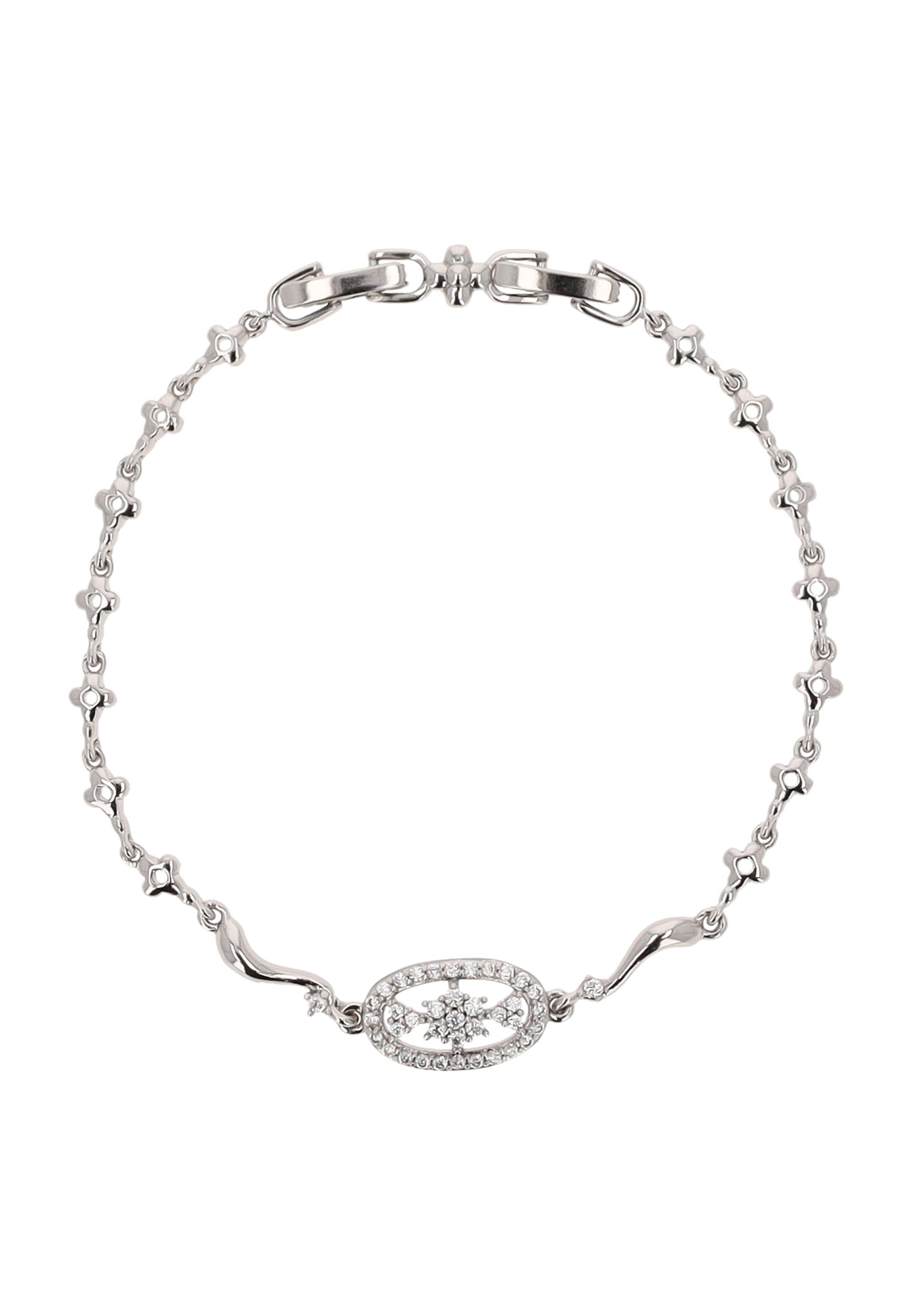 Dodaj odrobinę subtelnego blasku do każdej stylizacji dzięki tej bransoletce ozdobionej cyrkoniami. Jej prosty, ponadczasowy design łączy elegancję z delikatnym połyskiem, a zapięcie na zatrzask zapewnia bezpieczne i wygodne noszenie. Uniwersalny design sprawia, że ta bransoletka jest doskonałym uzupełnieniem wieczorowych strojów. Część kolekcji biżuterii.