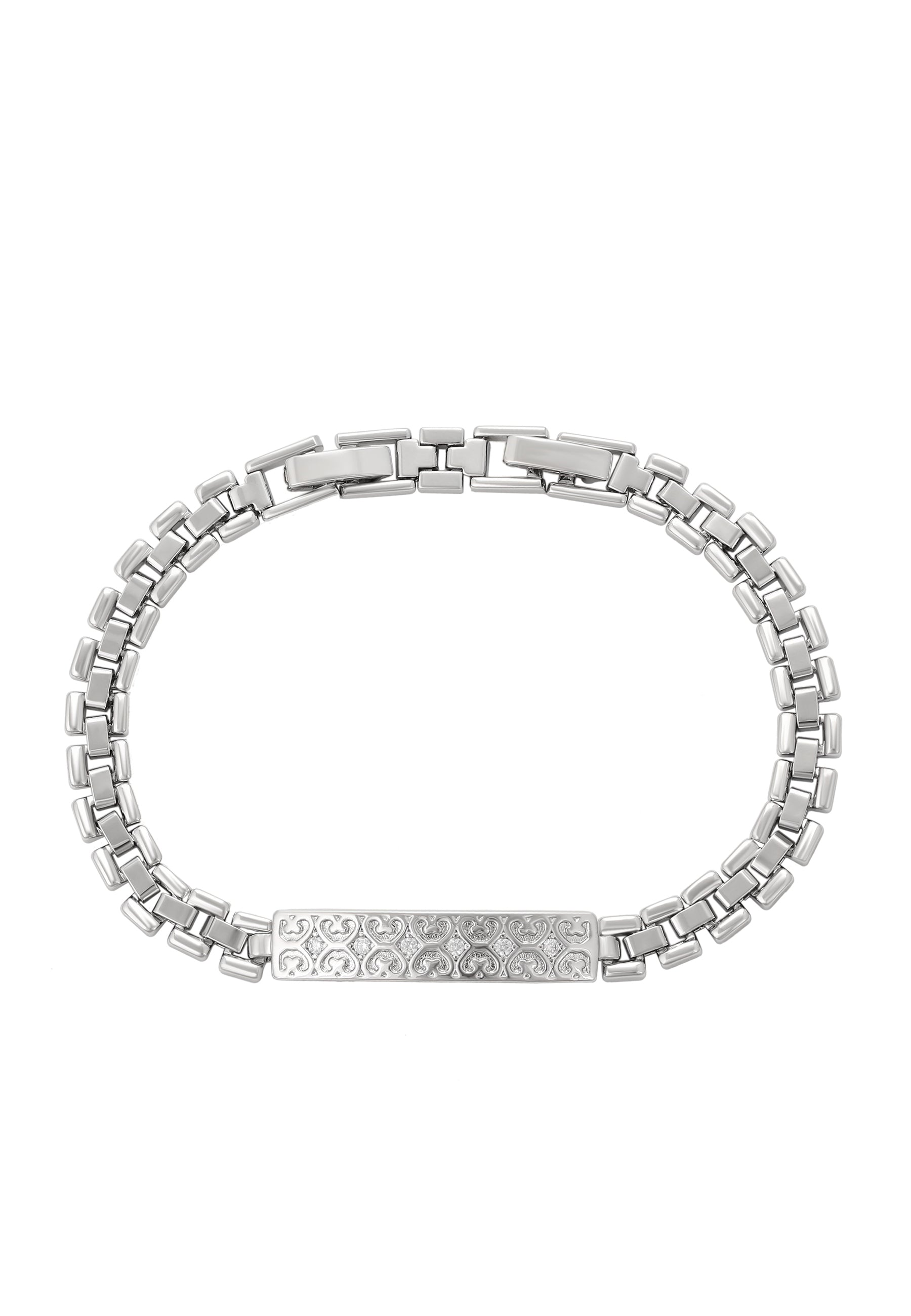 Ta elegancka bransoletka zachwyca oszałamiającym wzorem z przeplatanymi ogniwami i gładkim motywem. Wykonana z miedzi, ozdobiona jest błyszczącymi kamieniami cyrkonii sześciennej, dodającymi elegancji. Zapięcie na zatrzask zapewnia bezpieczne noszenie, czyniąc ten ponadczasowy element niezbędnym dodatkiem do Twojego wyglądu. Jest częścią naszej Kolekcji Biżuterii.