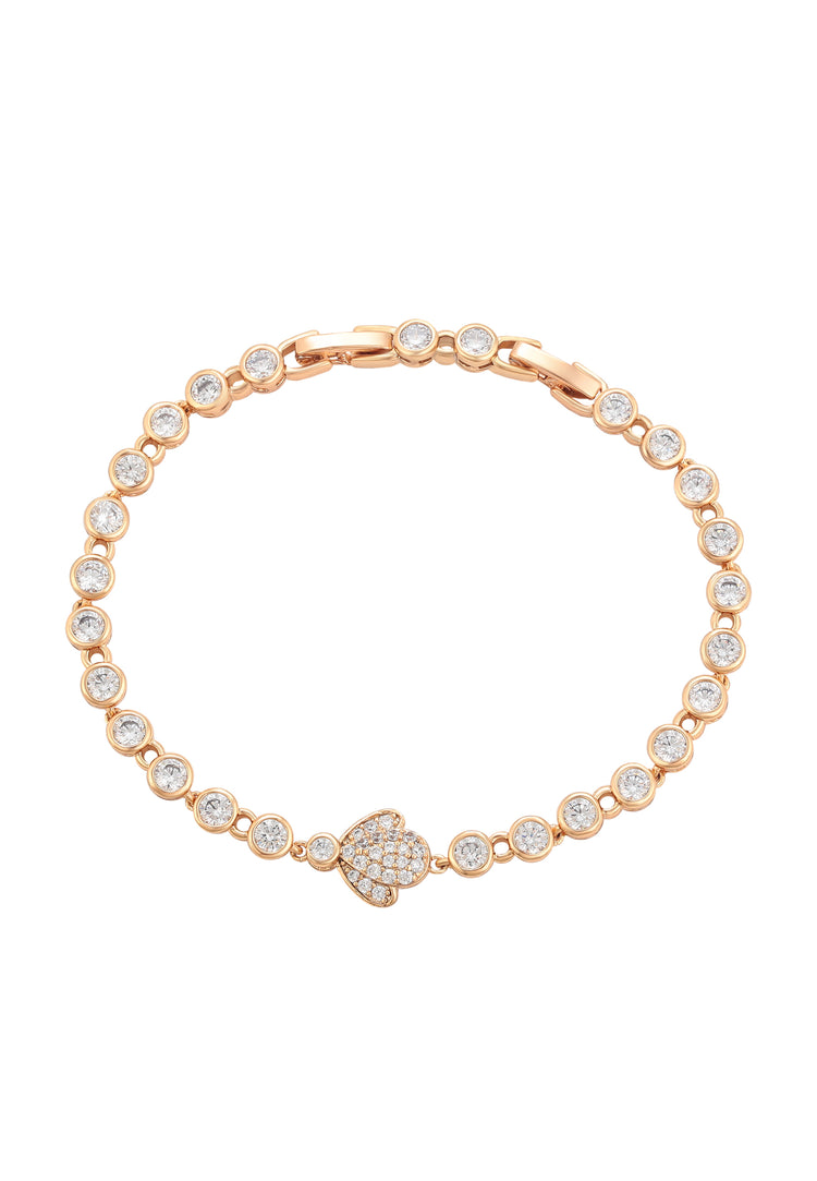 Dodaj odrobinę luksusu do swojego stylu dzięki tej bransoletce ozdobionej kryształami z naszej Kolekcji Biżuterii. Wykonana z promiennej miedzi i zdobiona błyszczącymi cyrkoniami, posiada błyszczący wzór, który pięknie łapie światło. Zapięcie na zatrzask zapewnia bezpieczne i wygodne dopasowanie, a elegancki, migoczący design wnosi ponadczasowy urok do każdej stylizacji. Idealna do podkreślenia zarówno codziennych, jak i wyjątkowych kreacji, ta bransoletka to definicja wyrafinowanej elegancji.