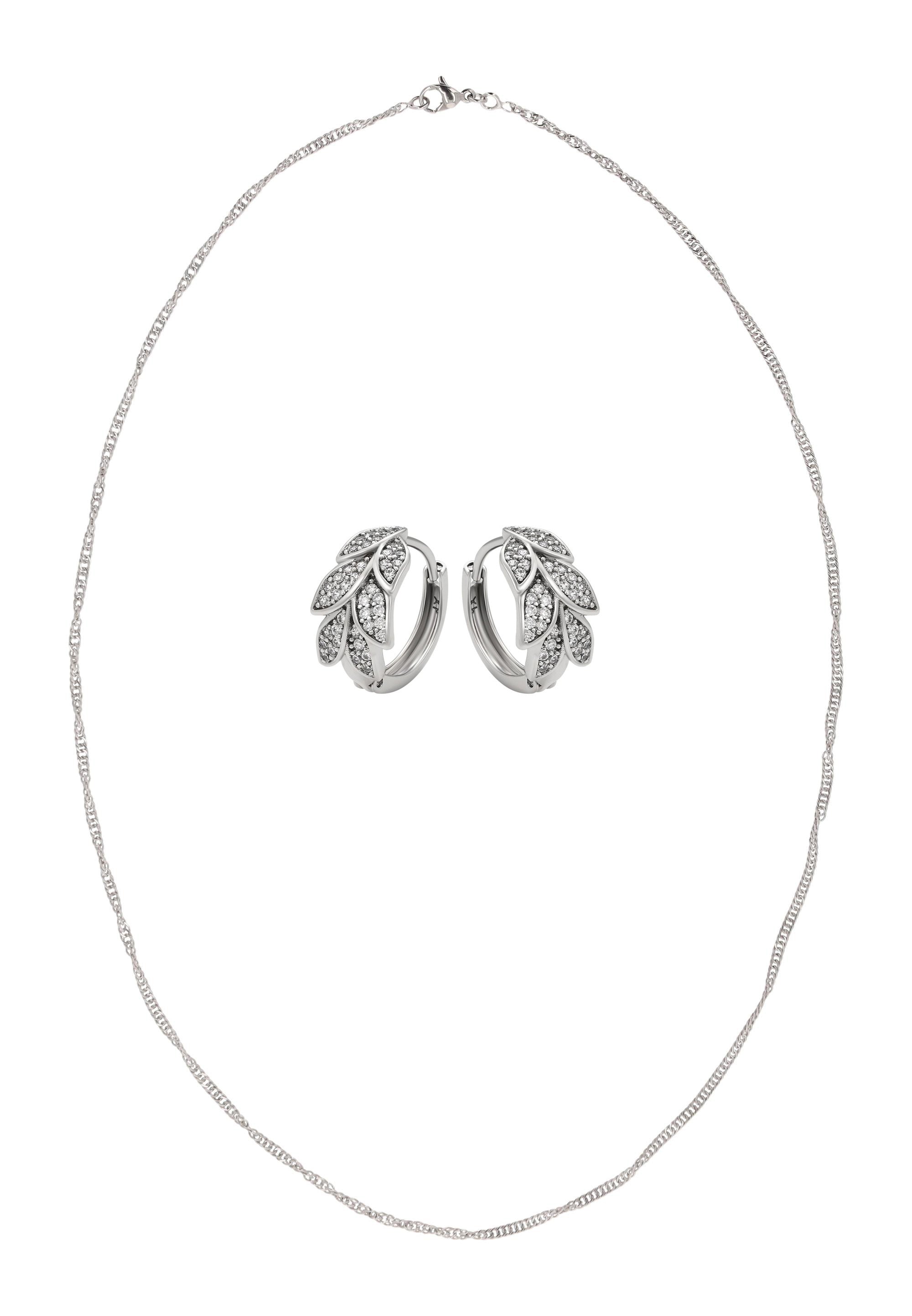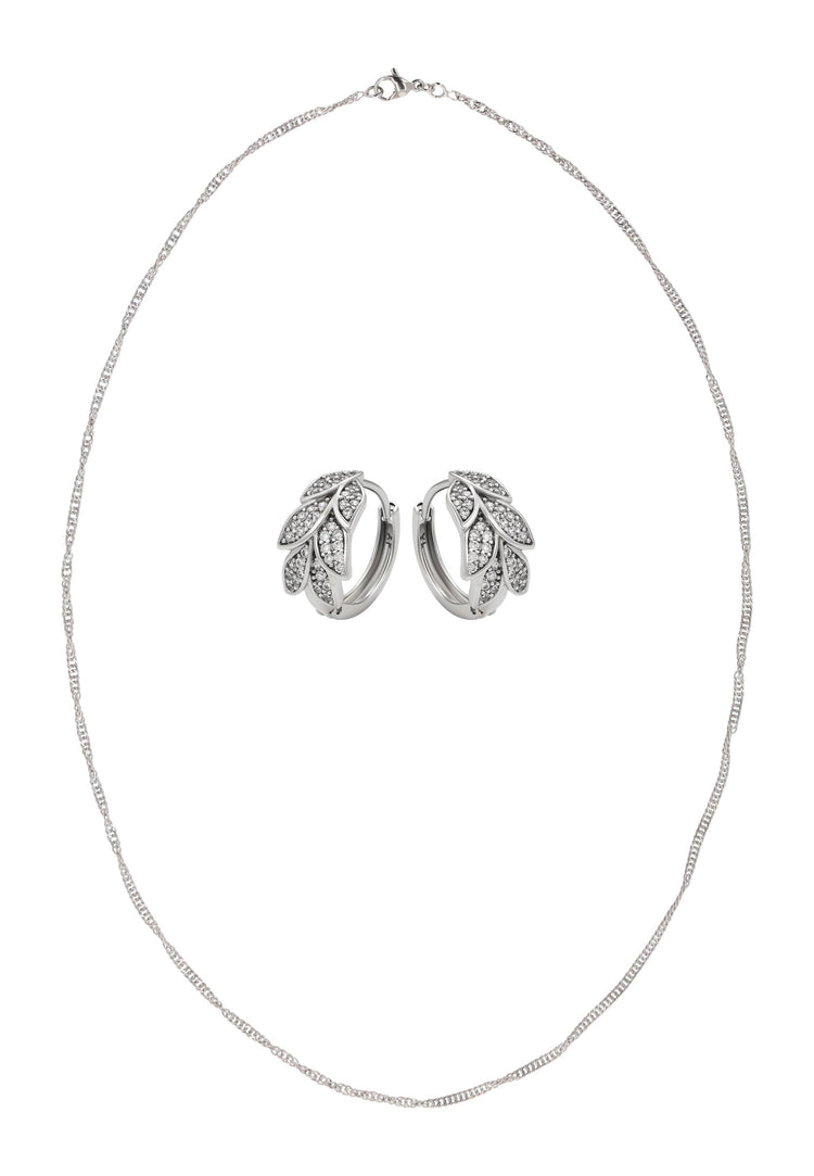Wprowadź elegancję inspirowaną naturą do swojego wyglądu dzięki temu zestawowi biżuterii z naszej Kolekcji Biżuterii. Ten zestaw naszyjnika i kolczyków wykonany jest z miedzi z błyszczącym wzorem, zawiera klasyczny naszyjnik na łańcuszku z bezpiecznym zapięciem typu lobster. Pasujące kolczyki koła z motywem liścia ozdobione są cyrkoniami i wykończone zapięciami na zawiasach dla wygodnego i niezawodnego noszenia. Elegancki, wszechstronny i ponadczasowy, ten zestaw dodaje błyszczącego uroku zarówno codziennym stylizacjom, jak i specjalnym okazjom.