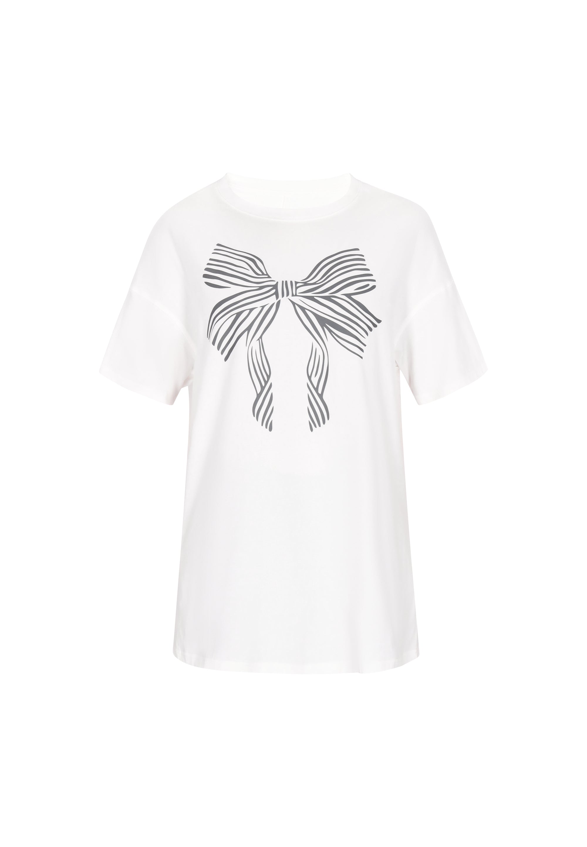 Podnieś swój codzienny styl dzięki tej modnej tunice, która charakteryzuje się regularnym krojem i stylowym opadającym ramieniem. Z okrągłym dekoltem i krótkimi rękawami zapewnia wygodę idealną na casualowe wyjścia. Uroczy nadruk z motywem kokardki na dzianinowej tkaninie dodaje zabawnego akcentu, czyniąc ją niezbędną tuniką w Twojej kolekcji Fashion Look.