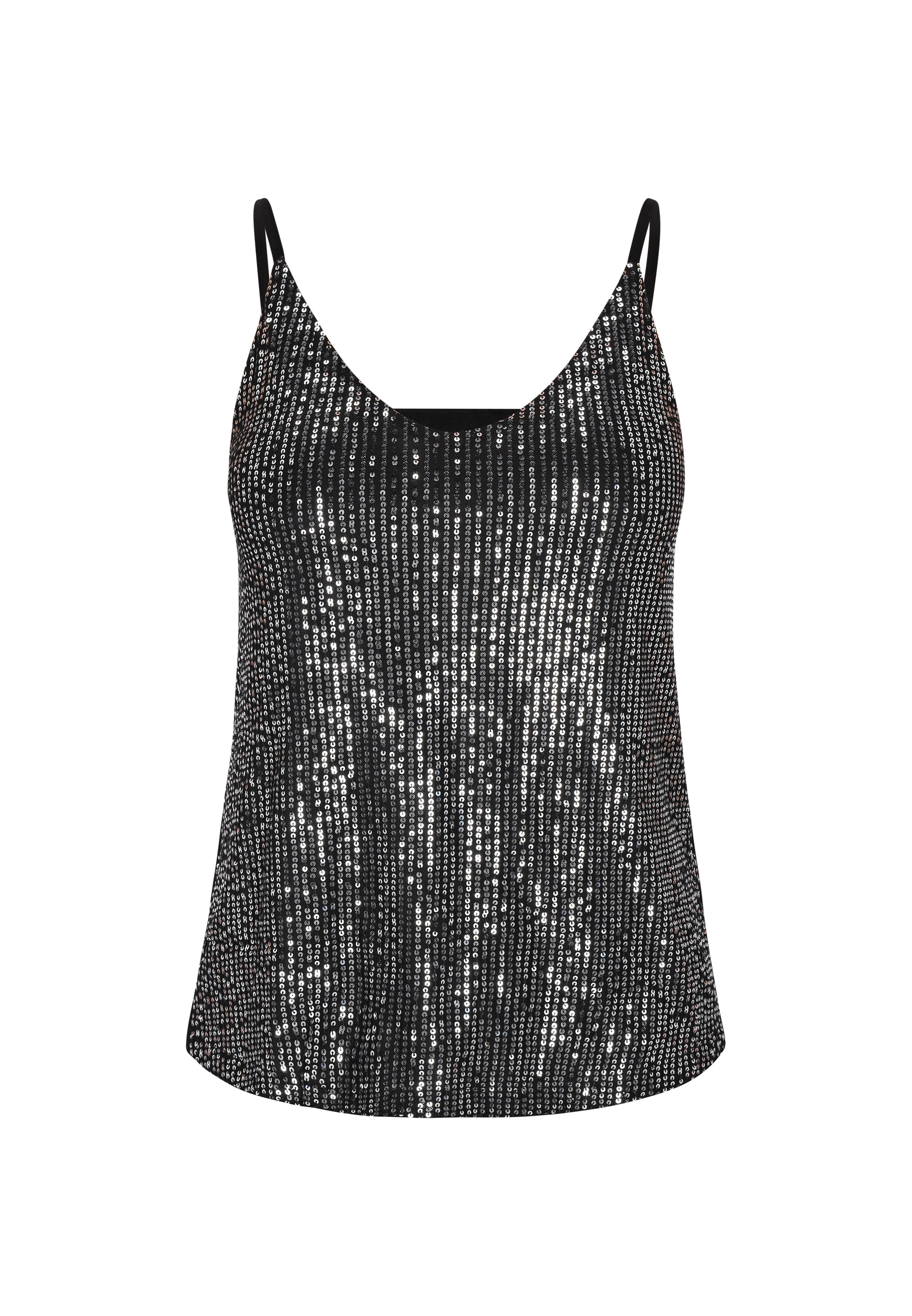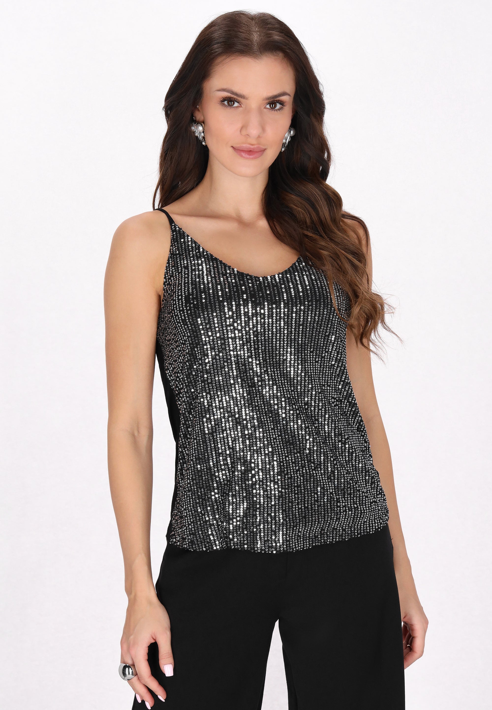 Podkreśl swój wieczorowy styl dzięki tej oszałamiającej bluzce z kolekcji Fashion Look. Posiada regularny krój, dekolt w serek i delikatne ramiączka, które emanują imprezowym urokiem. Ozdobiona błyszczącymi cekinami i siateczkowymi akcentami, ta stylowa bluzka jest idealna dla miłośników mody, którzy chcą zabłysnąć na każdej imprezie lub spotkaniu.