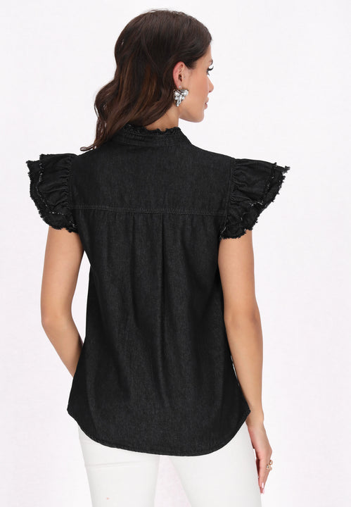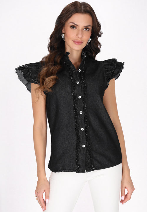Prezentujemy stylową bluzkę z wysokim kołnierzem i falbanką, z krótkimi rękawami zakończonymi rozkloszowanymi krawędziami dla kobiecego akcentu. Ta zapinana na guziki bluzka ma dopasowaną sylwetkę, uzupełnioną surowym wykończeniem na dole, co nadaje casualowy, a zarazem szykowny wygląd. Idealna dla miłośniczek codziennej mody, które szukają modnego dodatku w kolekcji Fashion Look.