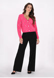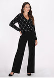 Introducing a stylish knitted button cardigan with a ribbed v-neckline. This cardigan features long sleeves, ribbed cuffs, and a patterned design with diamond-shaped detailing. Embellished with jewels in a regular pattern, it offers a fitted silhouette.