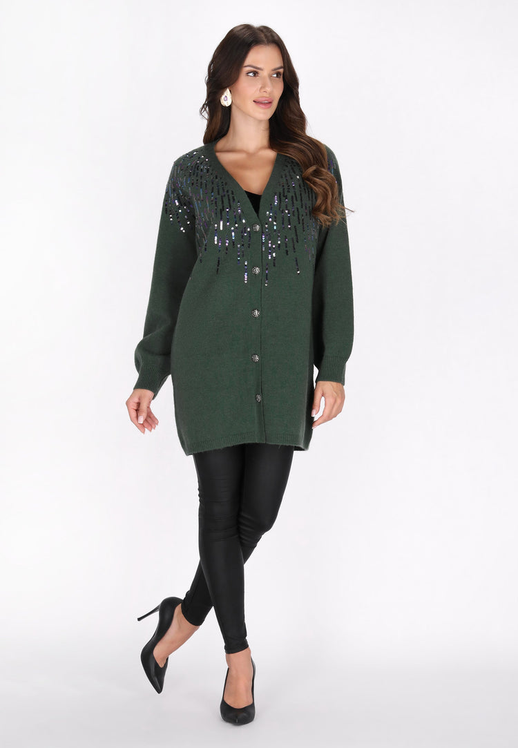 Transform your style with this long, elegant V-neck cardigan that radiates charm. Adorned with sparkling sequins and stylish buttons, it brings sophistication to any outfit. The soft knitted fabric ensures comfort, while the ribbed cuffs and hem enhance its refined appeal.This warm sweater with long sleeves is perfect choice for elegant event.