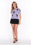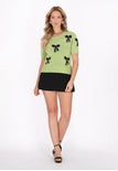 We present a stylish sweater with a regular fit, round neckline and short sleeves. The knit fabric provides a soft texture, and the bow pattern decorated with small pearls adds elegance. Ideal for everyday wear, it combines comfort with a fashionable look, making it suitable for a variety of stylish occasions. It is part of the Fashion Look Collection.