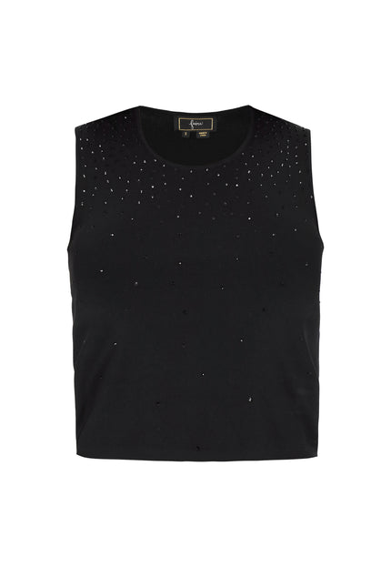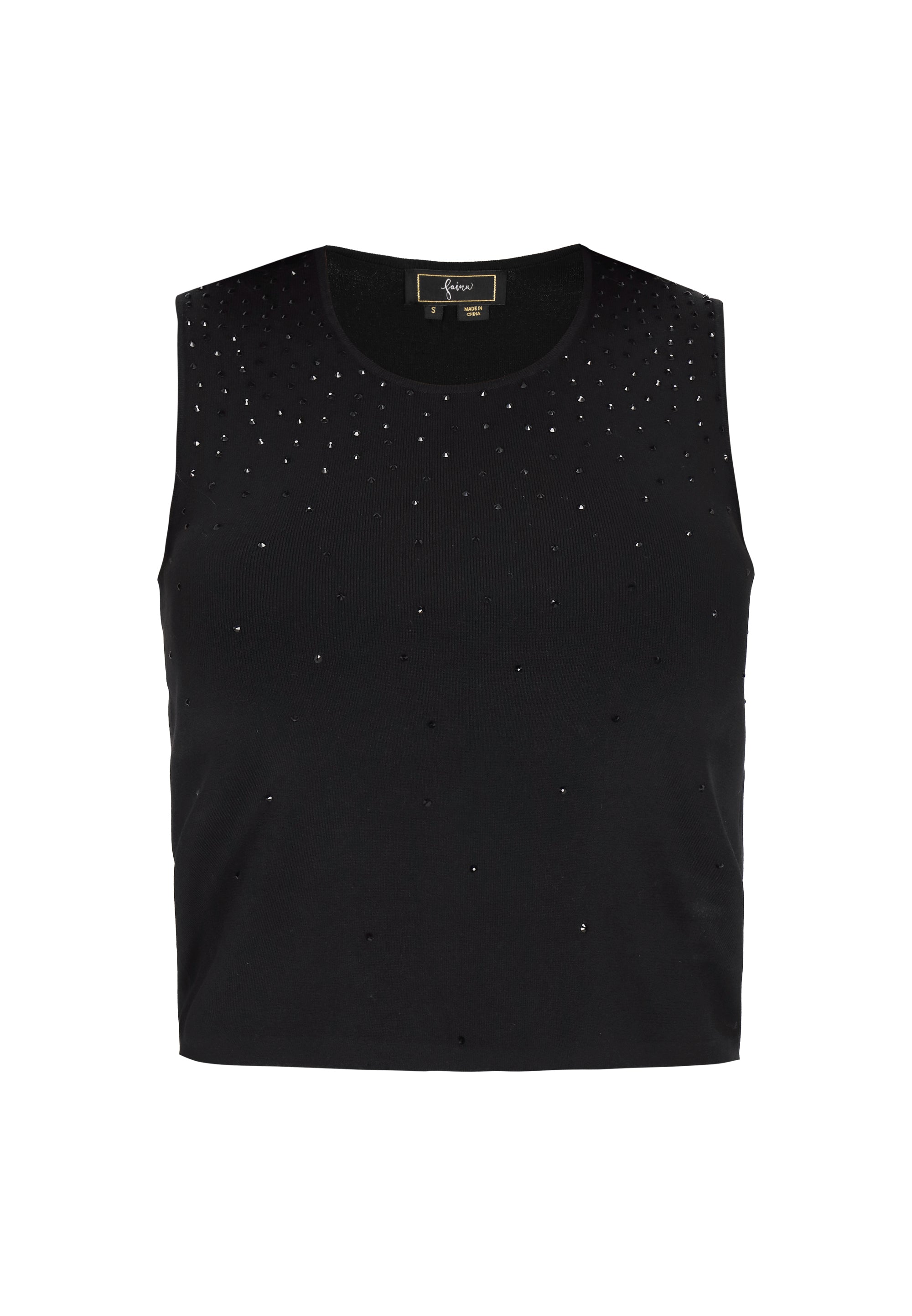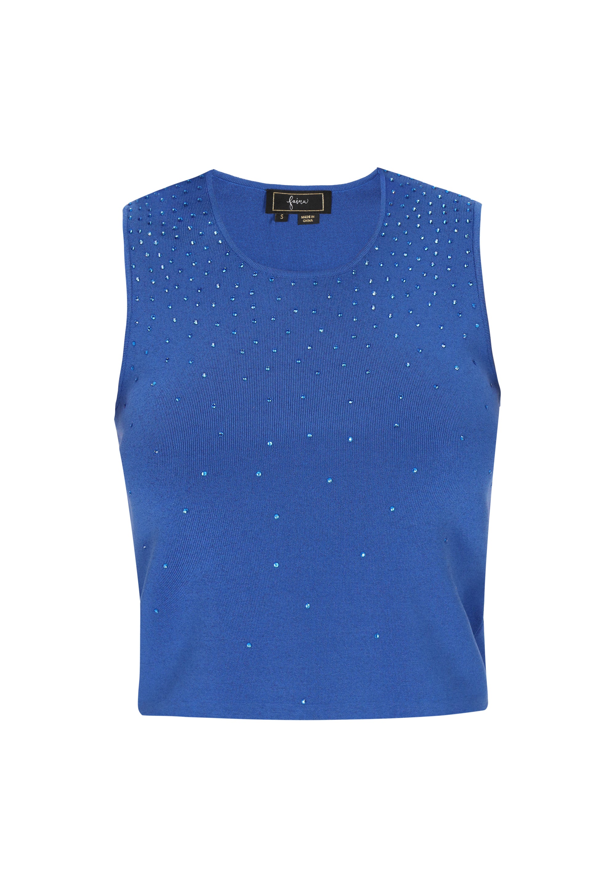 Elevate your everyday style with this stylish top featuring a regular fit and round neckline. The sleeveless style is accented with shimmering cubic zirconia, adding a touch of glamour. Made of soft knit fabric, it provides comfort while maintaining a chic silhouette. Perfect for casual outings or special occasions. It is part of the Fashion Look Collection.