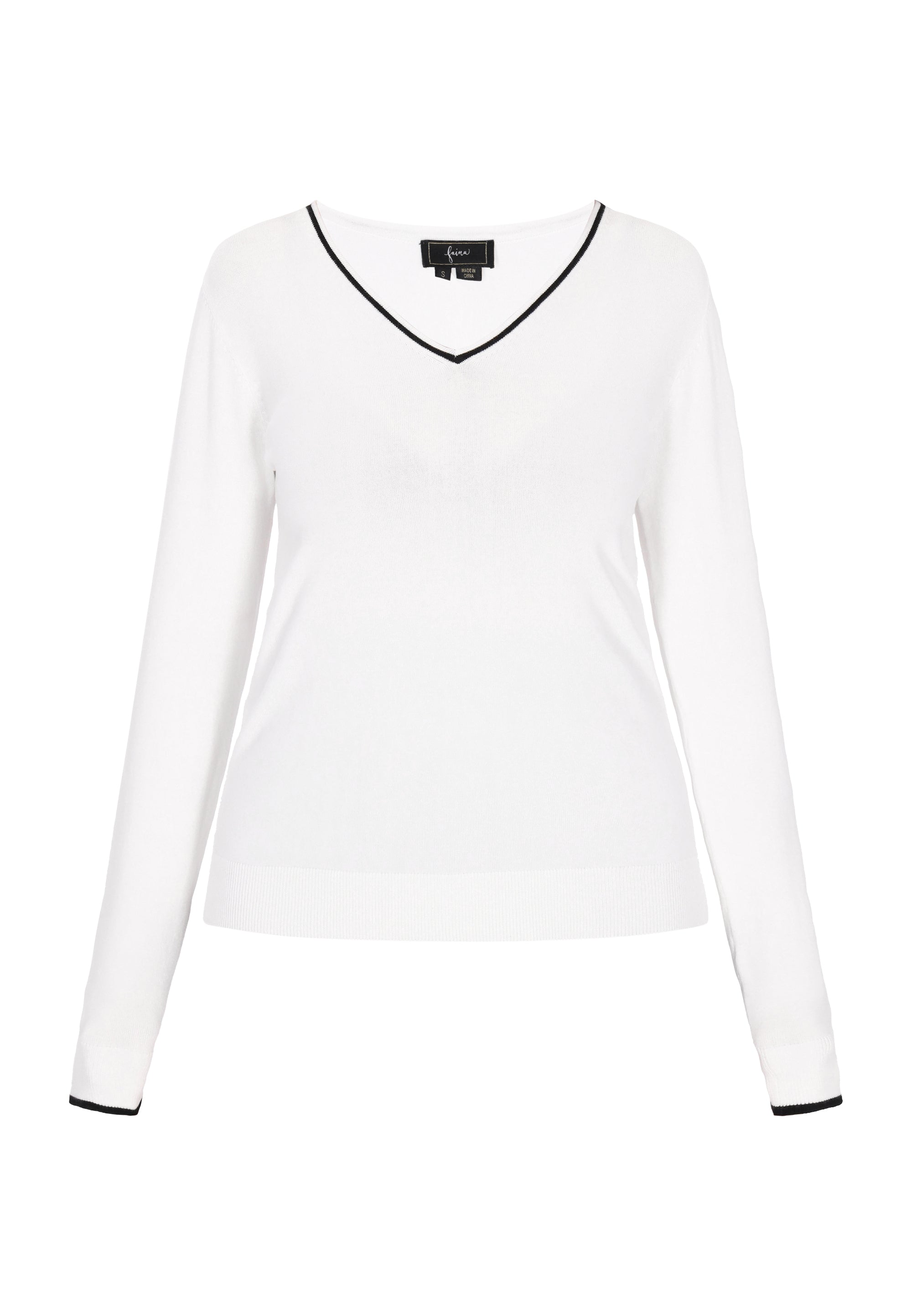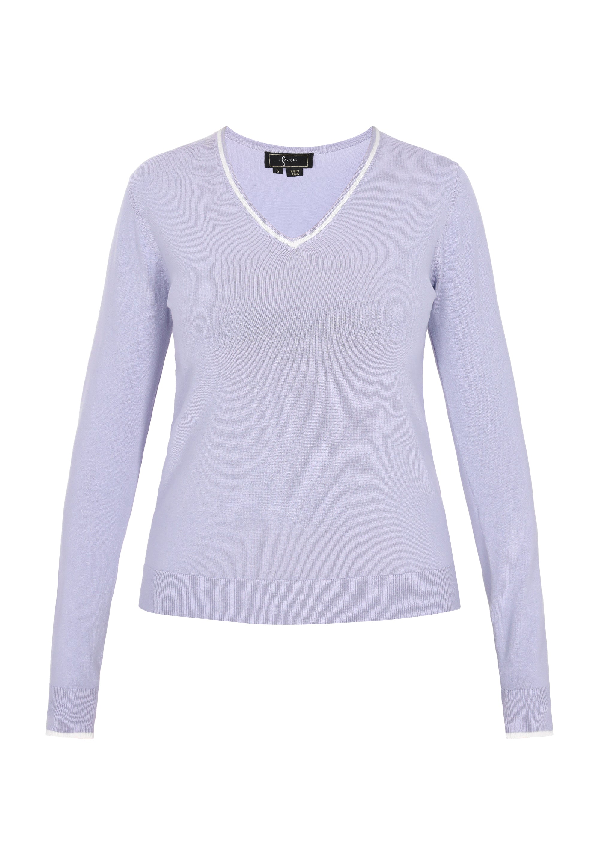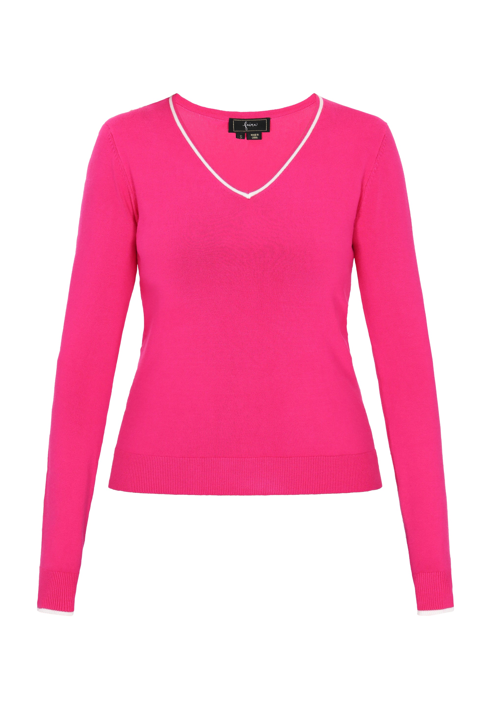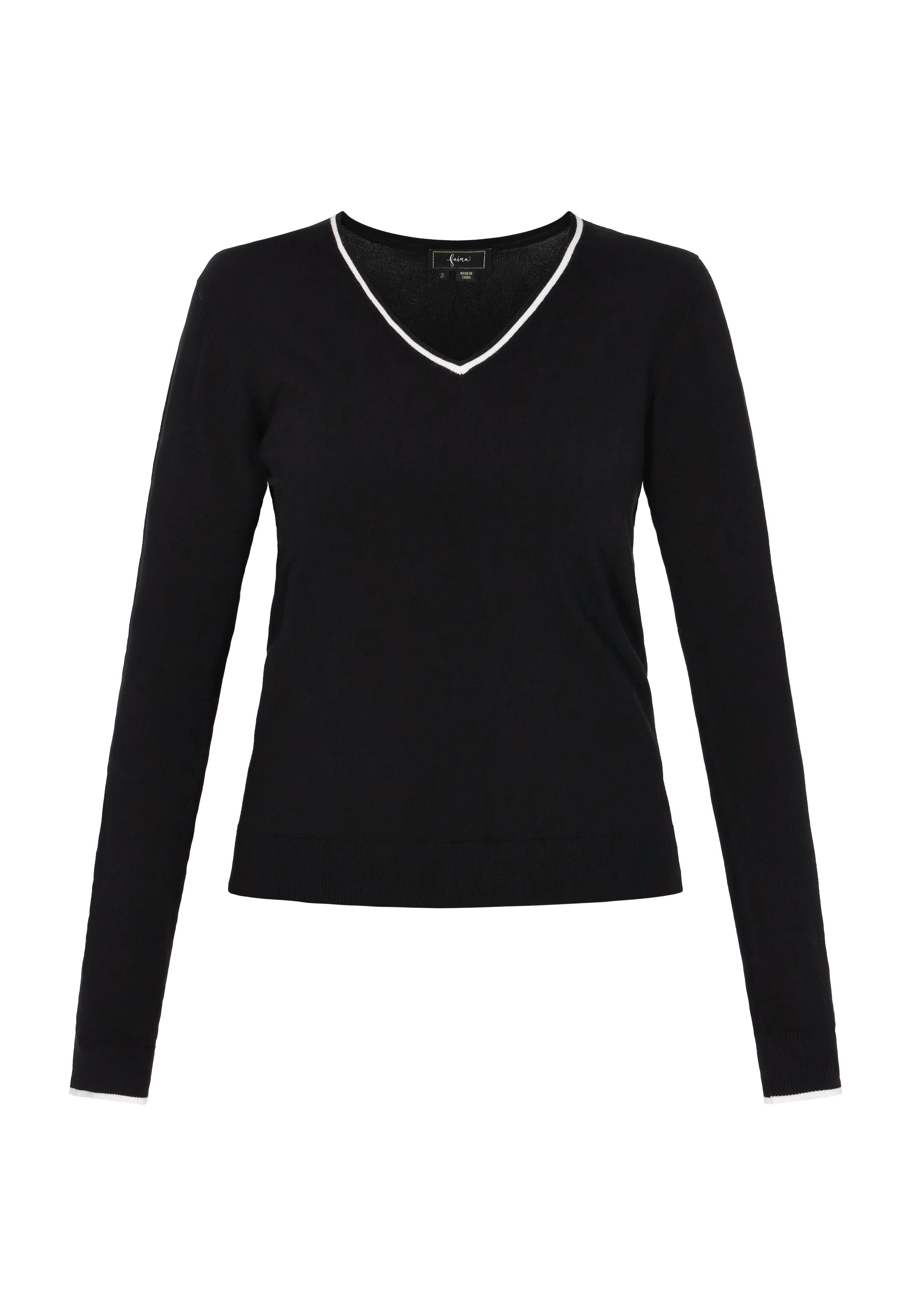 Enhance your closet with this stylish regular fit sweater with a pointed neckline, long sleeves and elegant contrast trim. Crafted from a soft knit fabric, it provides comfort perfect for everyday wear. The fitted silhouette enhances the look, while the ribbed hem adds a casual touch. It is part of the Fashion Look Collection.