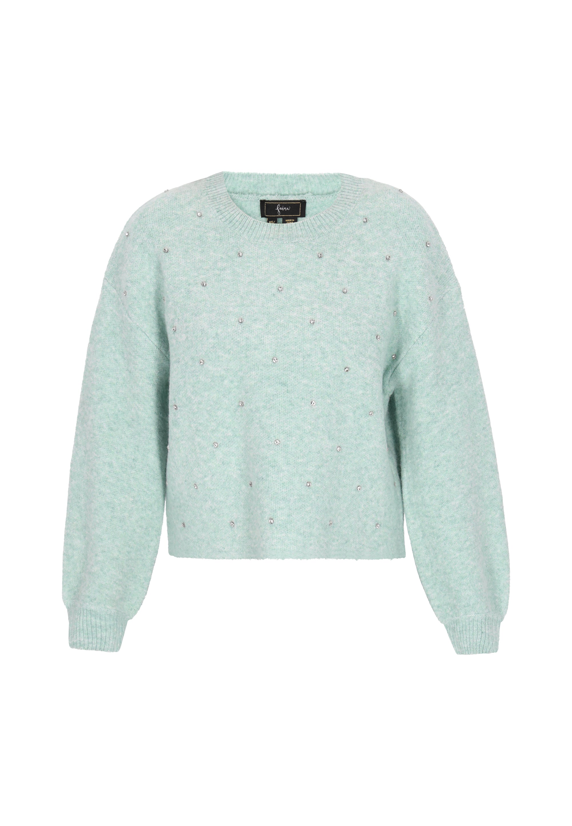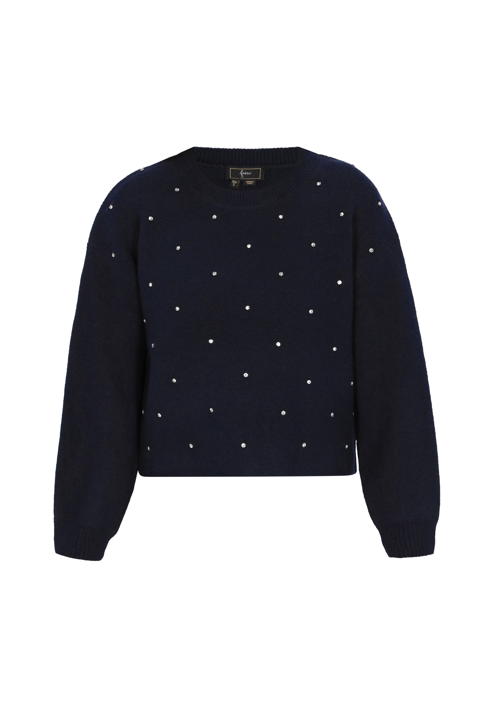 Elevate your casual style with this relaxed-fit sweater from the Fashion Look Collection. Made from soft knitted fabric, it features a classic plain pattern and a comfortable round neck. The long bishop sleeves and drop shoulder design create a trendy, laid-back silhouette. Delicate rhinestones add just the right amount of sparkle, making this sweater both cozy and fashion-forwardperfect for effortless everyday looks.